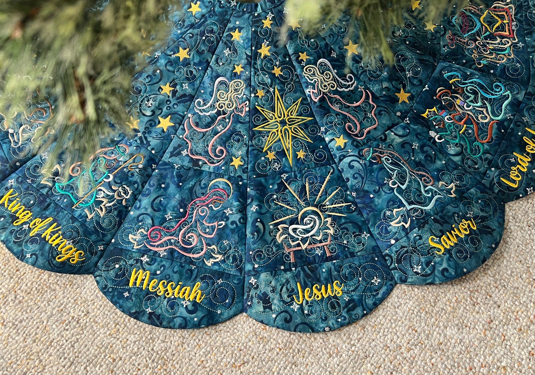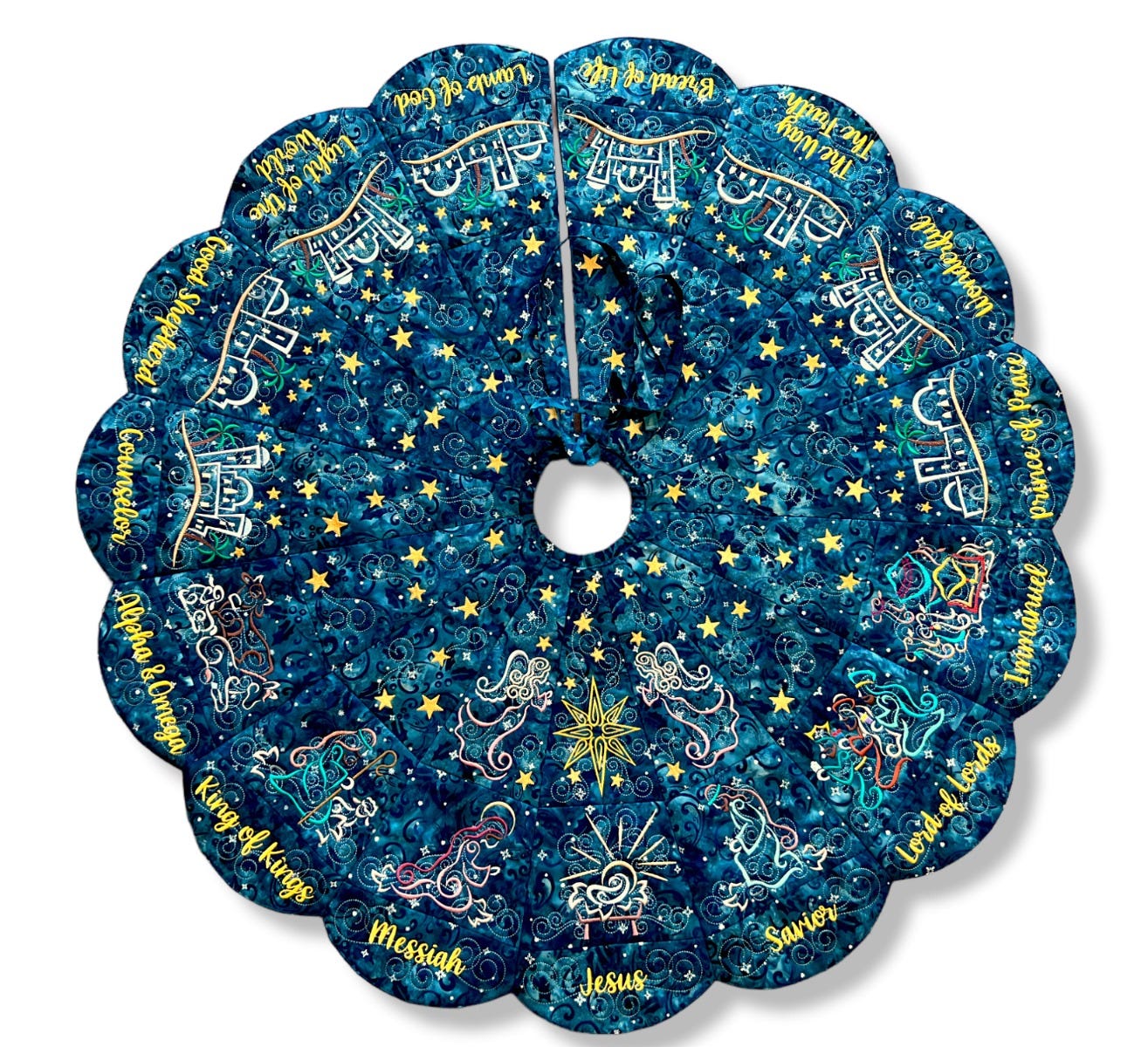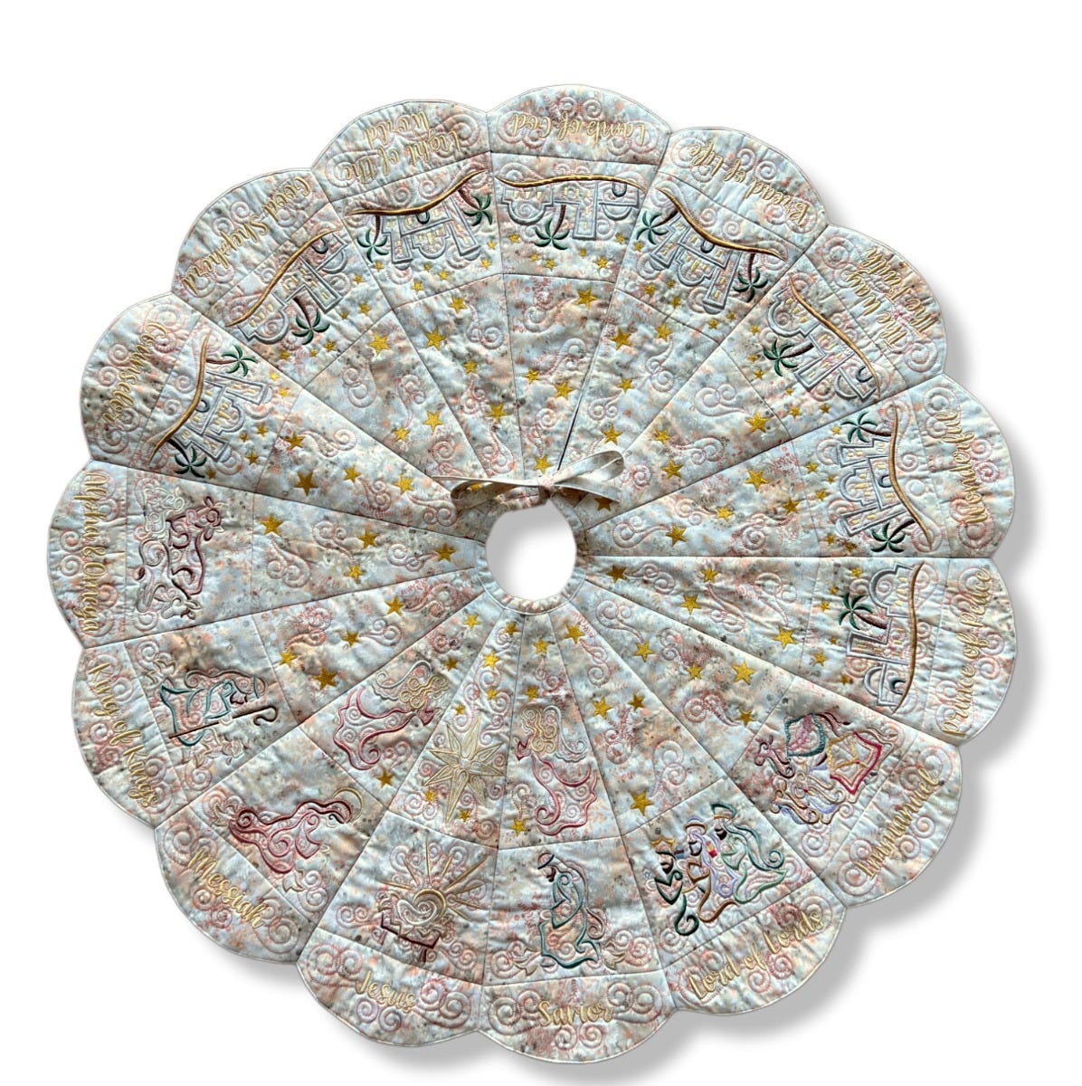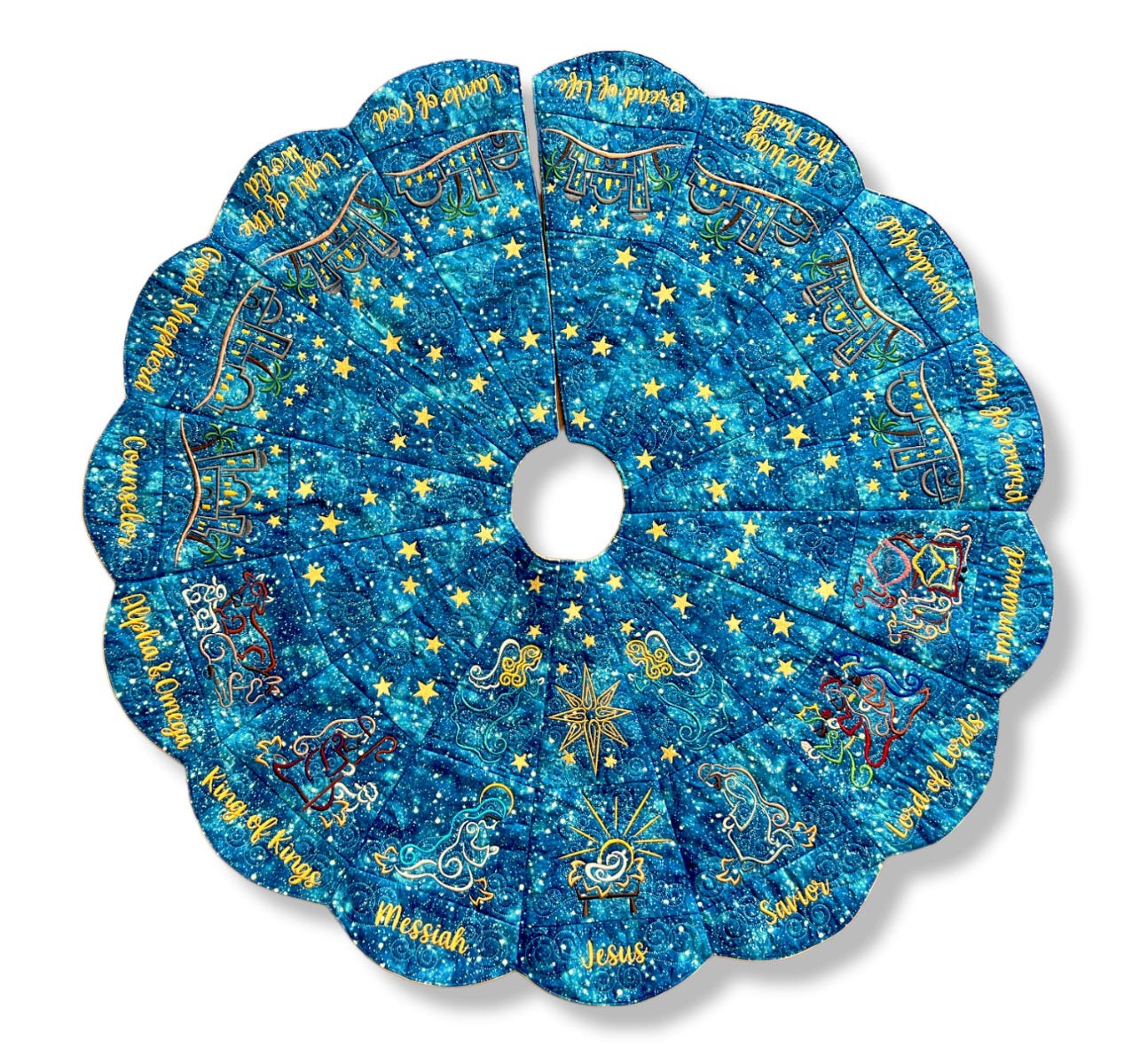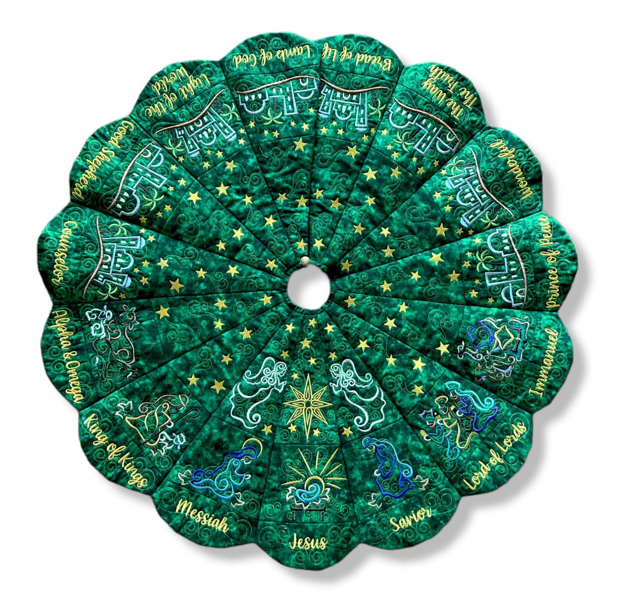 Note regarding the Outer Blocks: Only fifteen blocks are needed for the outer layer of the tree skirt, however nineteen blocks are included with purchase. Three words have alternate spelling options (Savior/Saviour, Immanuel/Emmanuel, Counselor/Counsellor) so be sure to select your preferred spelling when stitching out the blocks. Another block named Blank is included -- it has swirls but no text for those who wish to leave the outer blocks blank or wish to customize the block differently. Font Used: What a Time.