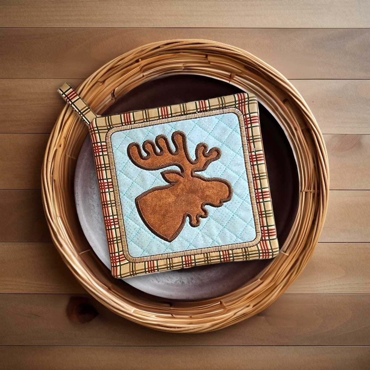 Our Moose Pot Holder features an applique square in the center with an applique moose head silhouette.