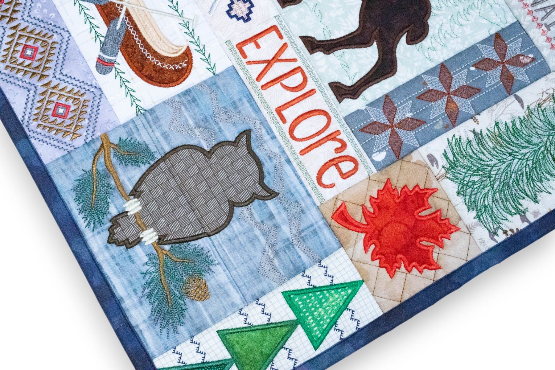 Requires 27 hoopings. Twenty-eight blocks are stitched completely in the hoop, then joined together with your sewing machine. The backing and tabs are added with your sewing machine.
