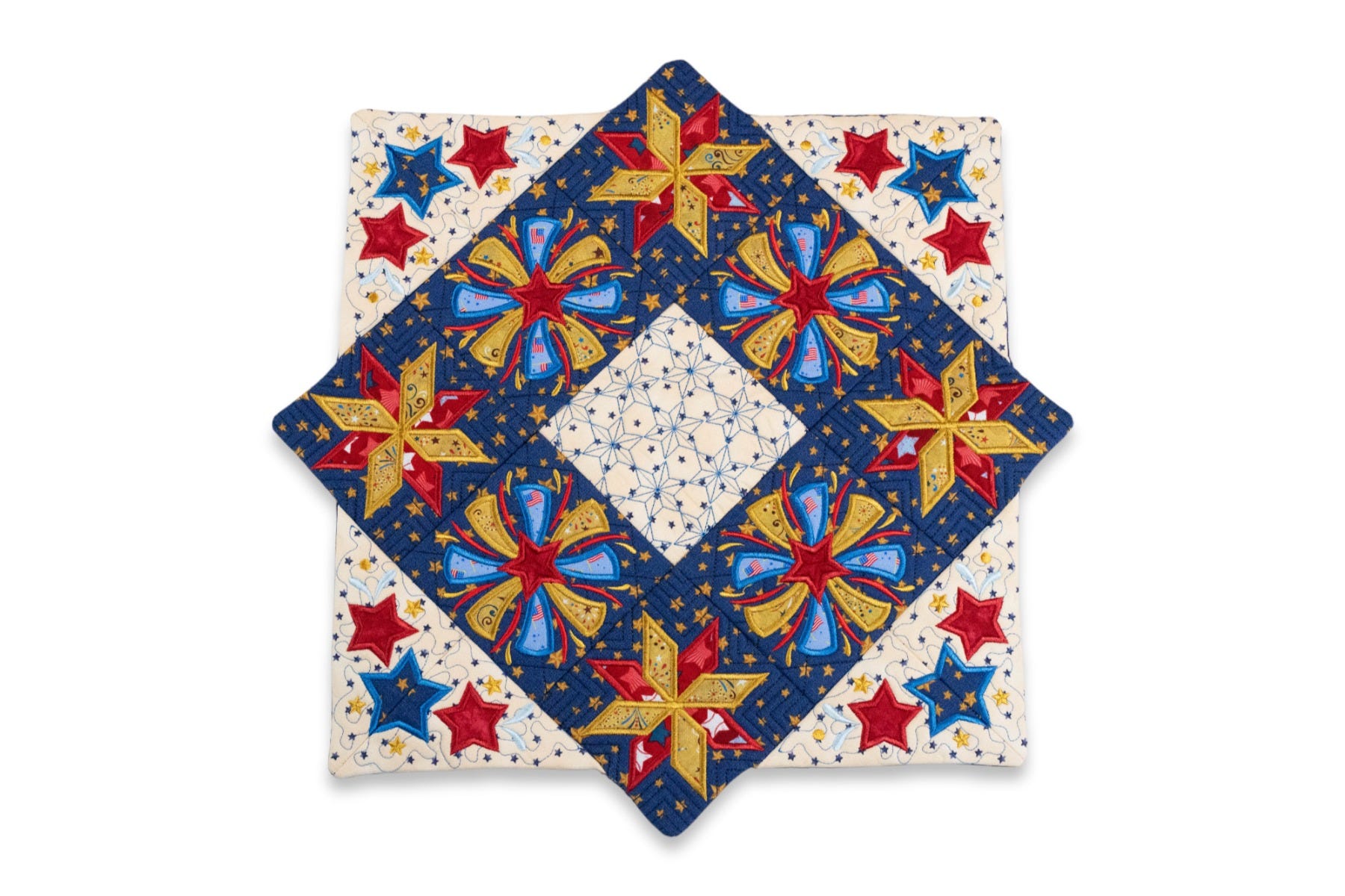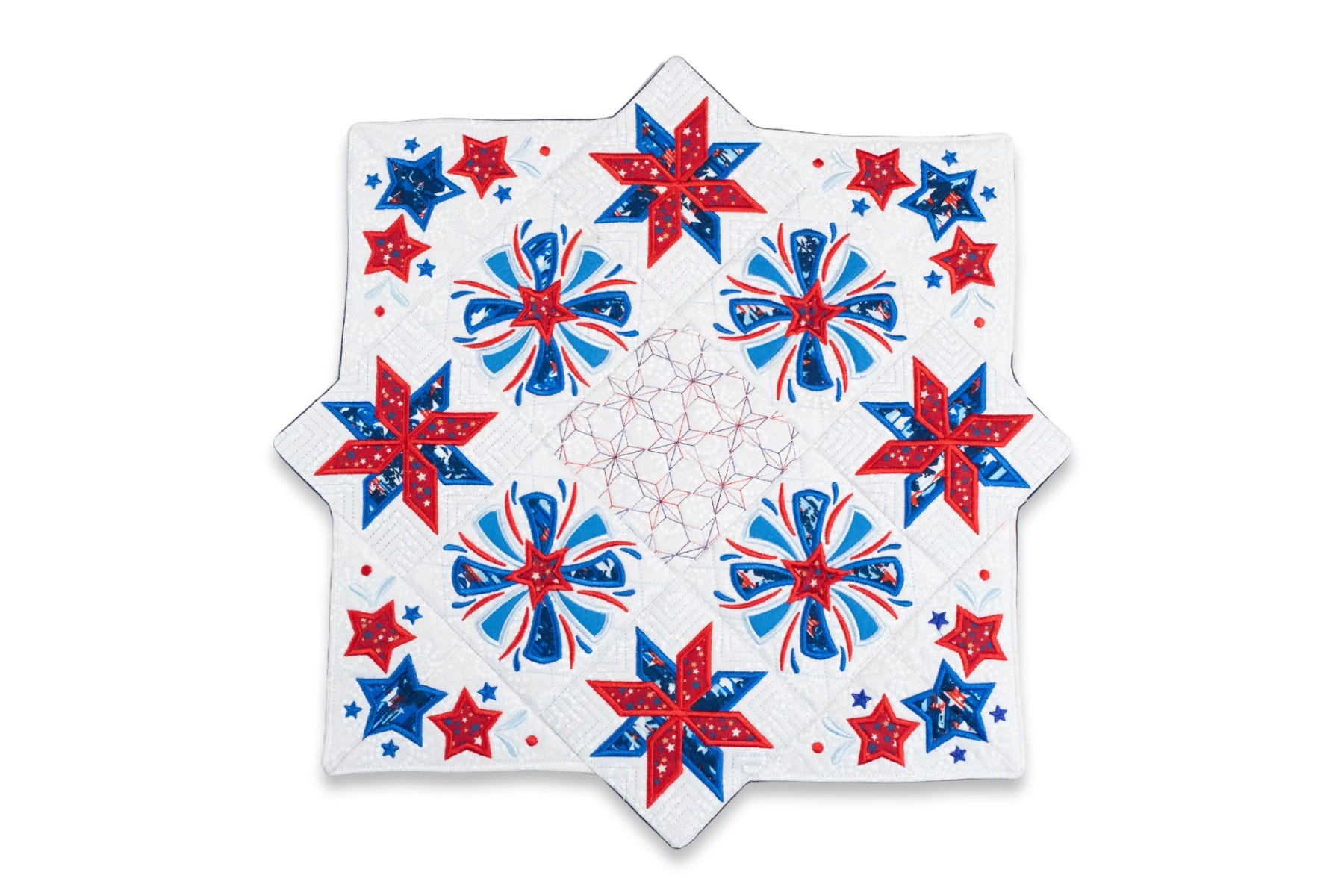 Decorate your dining room for Independence Day with our Patriotic Table Topper! Perfect for a round table, this topper features applique stars and pinwheel quilt blocks.
