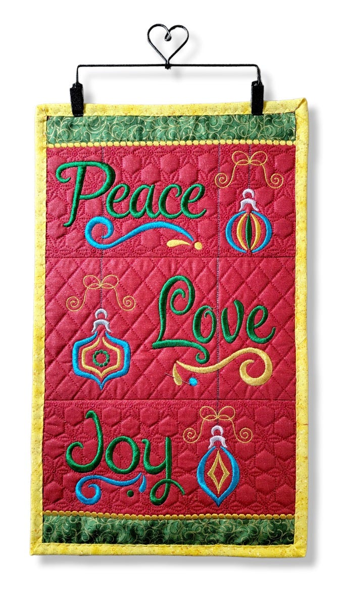Make inspirational decor with our Peace Love Joy Wall Hanging! Select fabric patterns and colors to create a unique project. This wall hanging features satin stitch lettering and design elements.