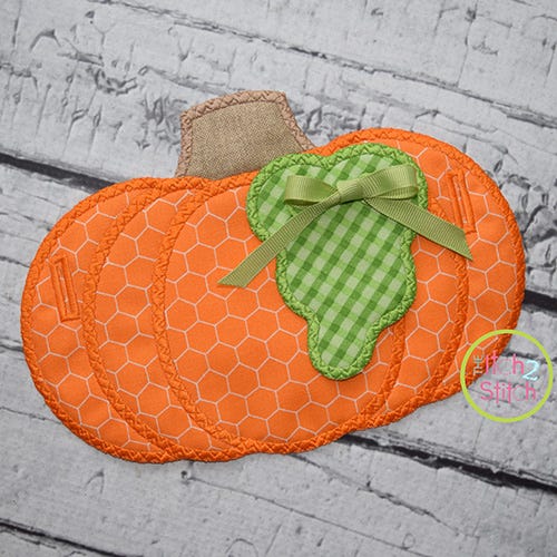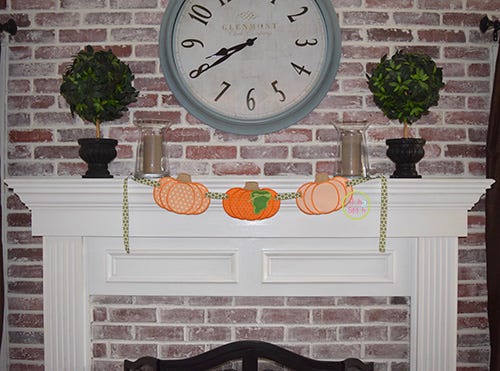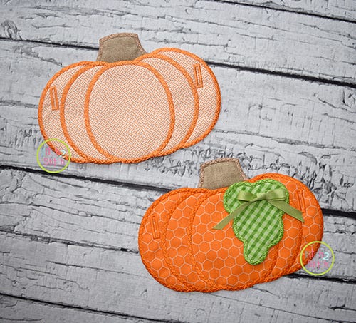 Two design files included with this listing: a pumpkin banner in three sizes (4x4, 5x7 and 6x10) and a leaf accent (three sizes to coordinate with each size of the pumpkin). The leaf accent is created in a separate hooping from the pumpkin and tied on with ribbon after completion.Ā