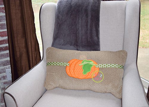 Pumpkin and Leaf are created in two separate hoopings, then tied together with ribbon upon completion.