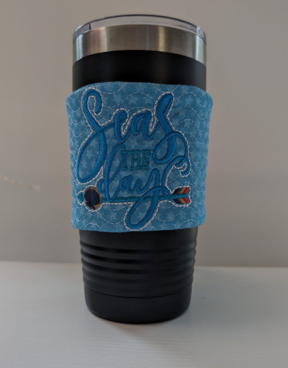 Seize your travel mug with our Seas the Day Sun Mug Wrap! This ITH coffee sleeve has an elastic and button closure. Works great with coffee mugs with handles!