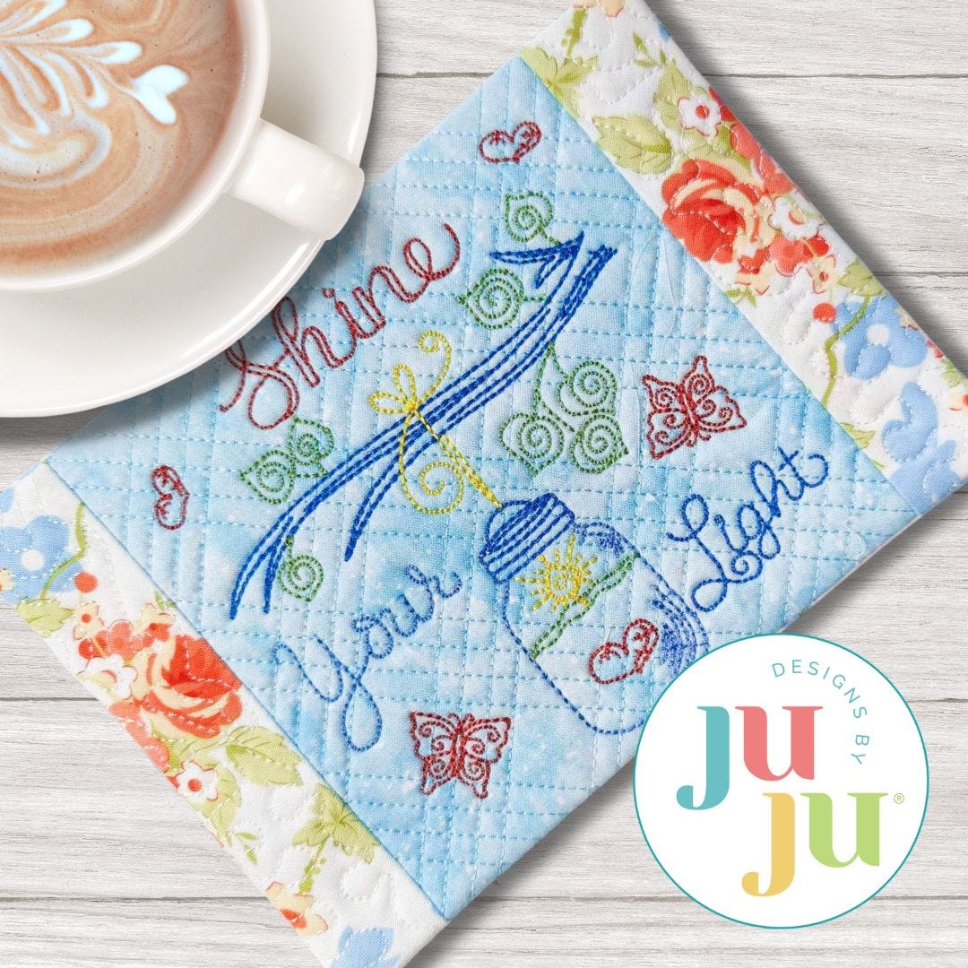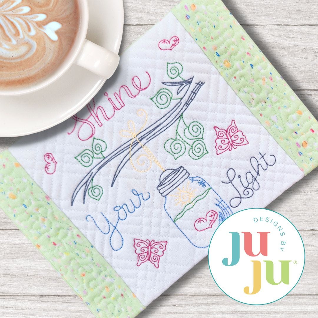 Shine Your Light! This encouraging Mug Rug features bean stitch lettering and details for a sweet vintage look.