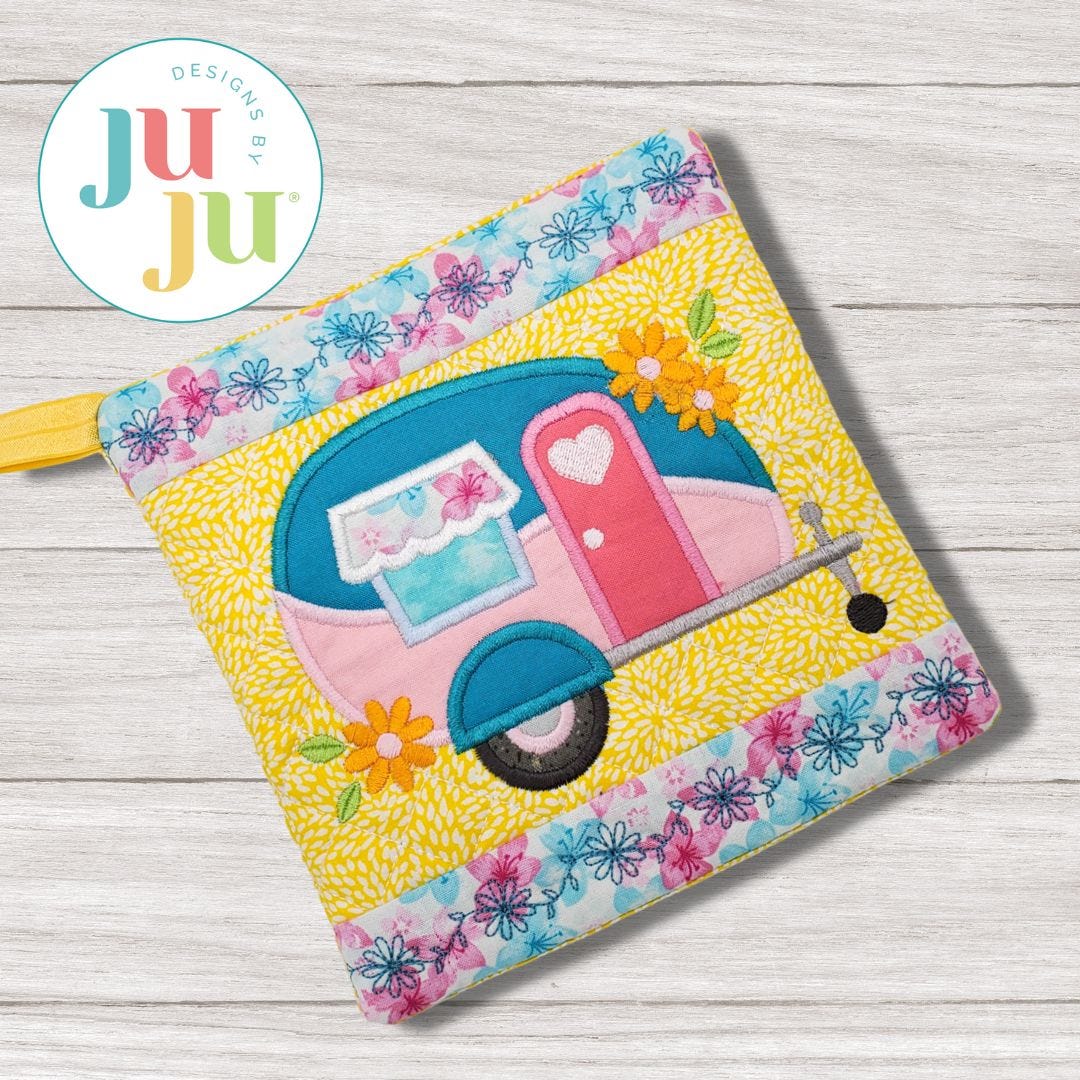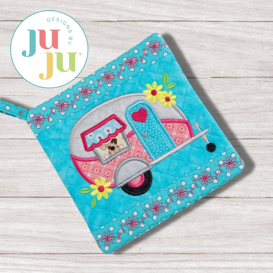 Decorate your mobile kitchen with our Trailer with Flowers Pot Holder! This pot holder features an applique camper with embroidered flowers.