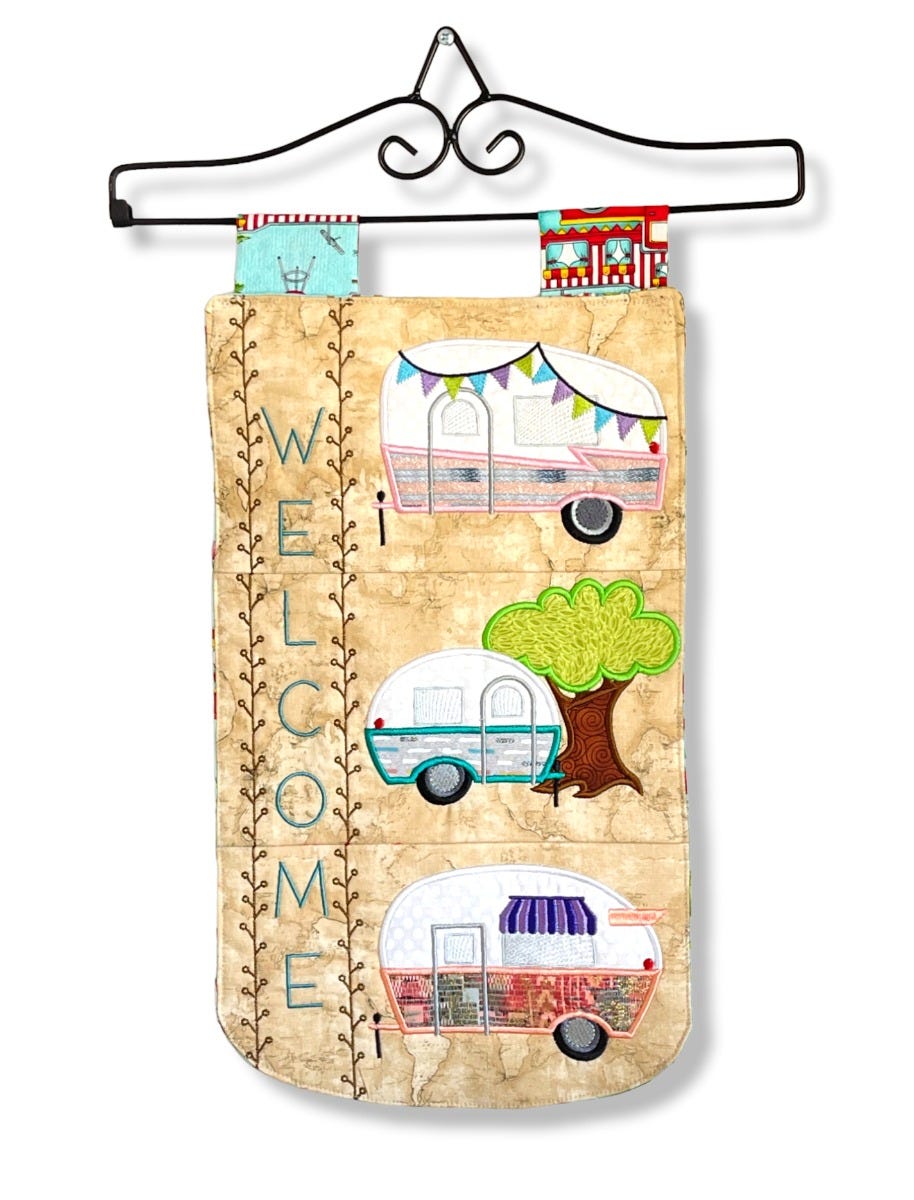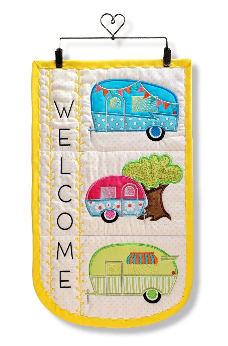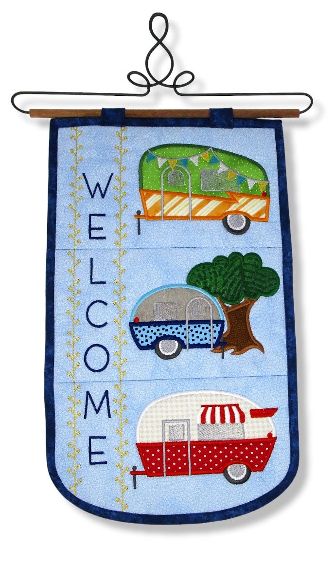 Greet visitors to your campsite with our Welcome Camper Wall Hanging! Select fabric patterns and colors to create a unique project. This wall hanging features applique designs with satin stitch lettering.