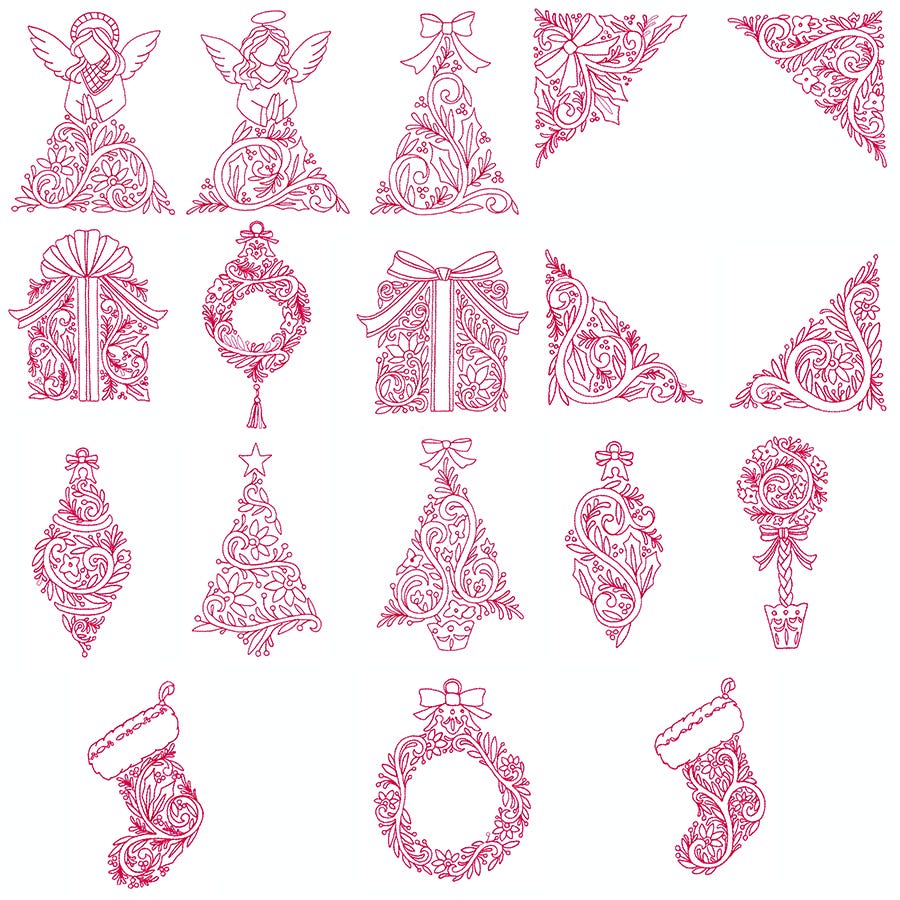 Here is a HUGE set of 18 absolutely gorgeous and elegant Jacobean Christmas designs which are perfect for a wide variety of Christmas projects. Use metallic or varigated threads to get a unique, elegant look.