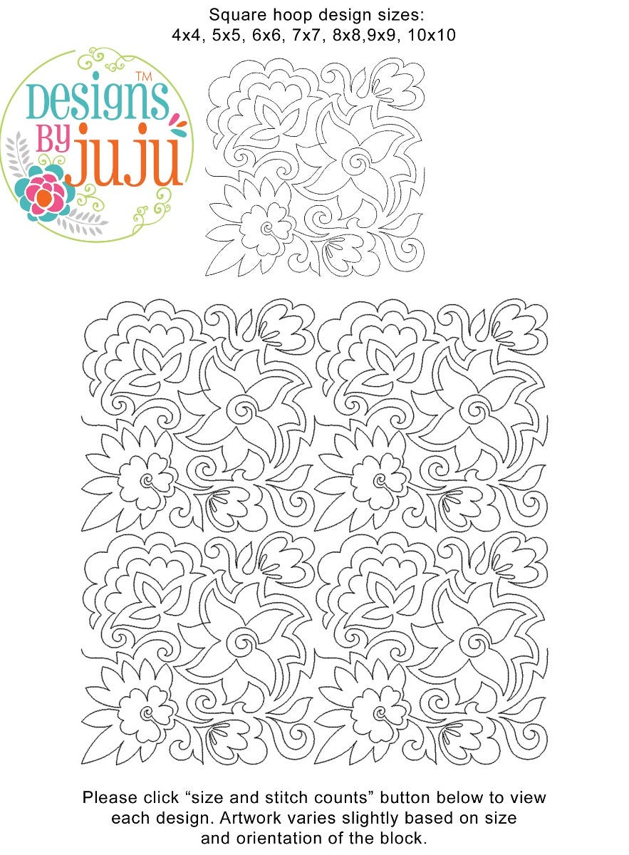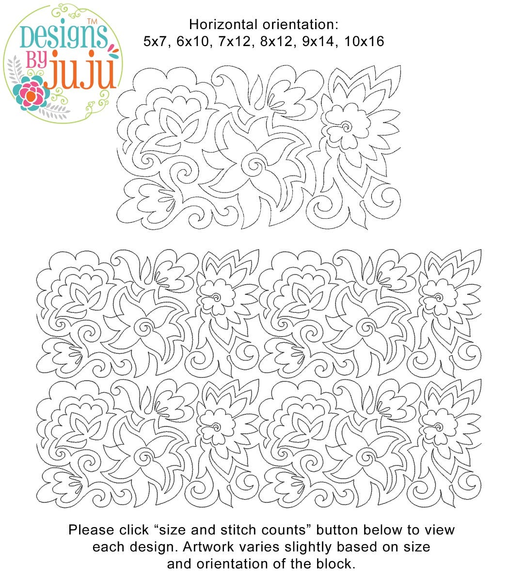 Please note: Both the scale of each pattern and arrangement of the motifs may vary based on the hoop size. Please click the "Size and Stitch Count" button to view the artwork for each size.