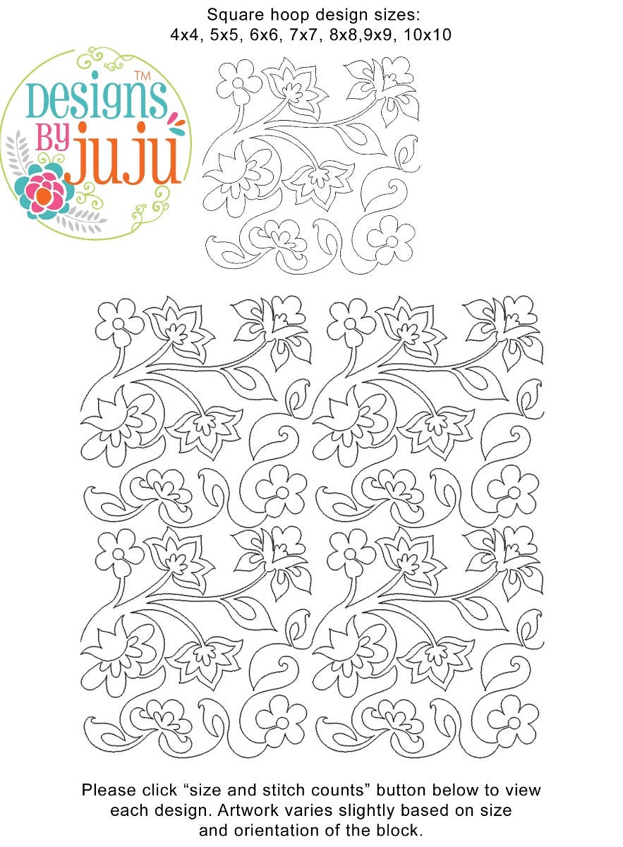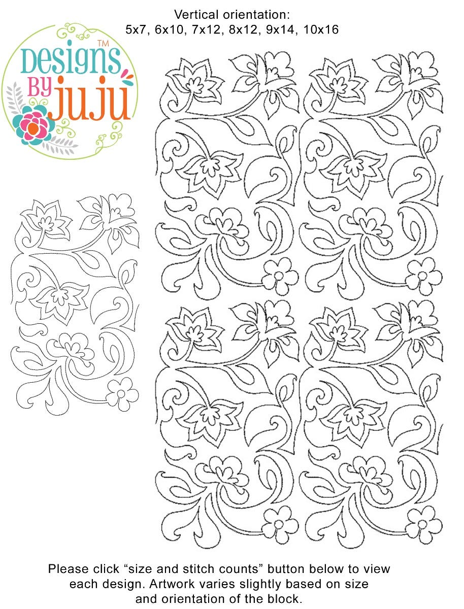 Please note: Both the scale of each pattern and arrangement of the motifs may vary based on the hoop size. Please click the "Size and Stitch Count" button to view the artwork for each size.
