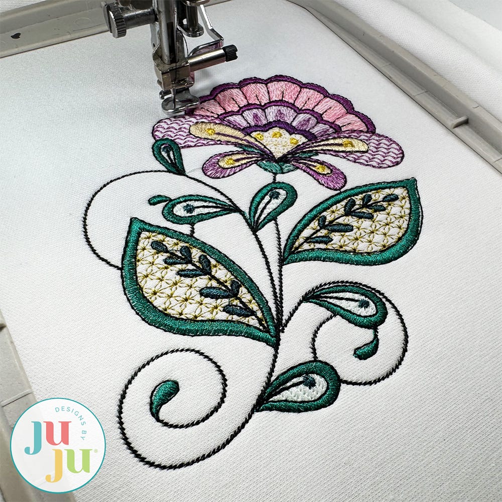 Bring timeless elegance to your next project with our Jacobean Flower 2 design! This graceful single embroidery-only design showcases a vintage-inspired floral pattern filled with swirling accents and delicate details - created with a blend of embroidery stitches including sketch-style, motif fill, satin stitch outlines, and more.