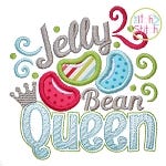 This design features multiple stitch styles: the jelly beans are applique; the "Jelly Bean" text, swirls and dots are satin stitch; the crown is a decorative fill stitch; the word "Queen" features a light and airy sketch fill pattern, outlined with a bean stitch.