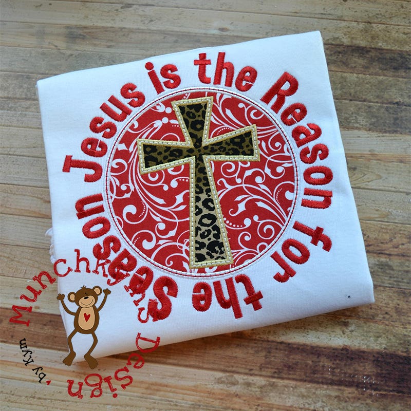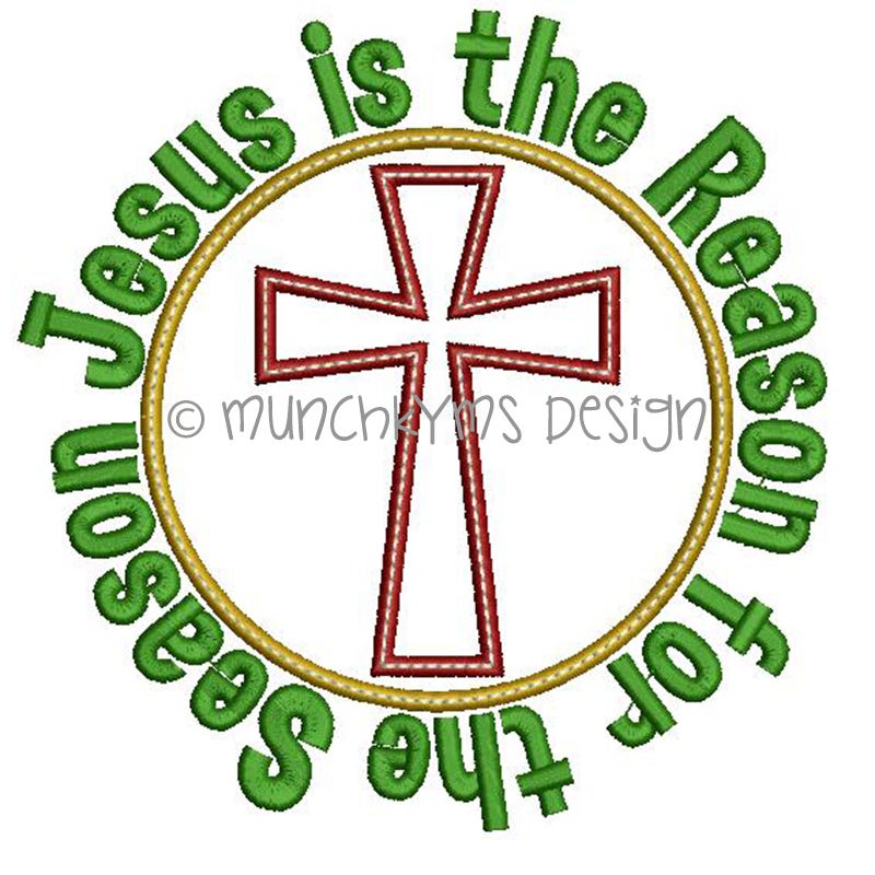 This two fabric applique features a bean stitch accent line on top of the satin stitches. The "Jesus is the Reason for the Season" text is included in the design file.