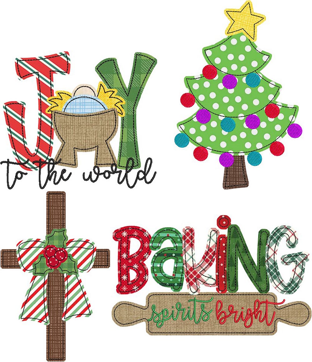 Have a Joyful Christmas with bean stitch applique designs! This set of four includes Baby Jesus, a cross with holly, a decorated tree, and a holiday baking-themed design. All embroidered text ("to the world" and "spirits bright") is included in the design file as pictured. Four sizes included (4x4, 5x7, 6x10 and 8x8).