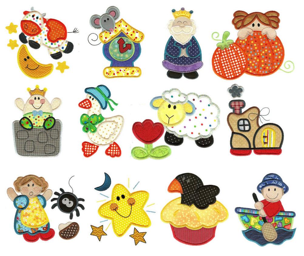 12 adorable nursery rhymes in applique! Perfect for nursery decor, clothing, quilts, cloth books and more. Would make a perfect gift!!