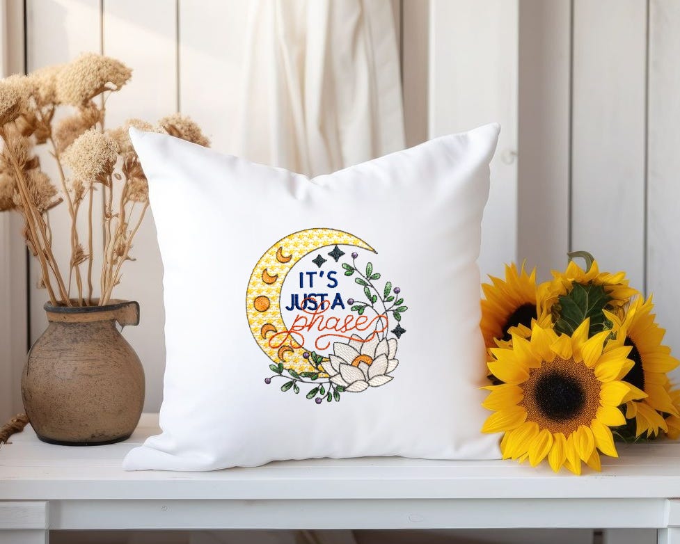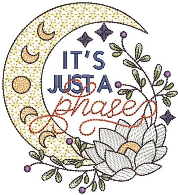 It's Just a Phase is a single design featuring a blend of sketch and motif fills with satin stitch and bean stitch lettering.