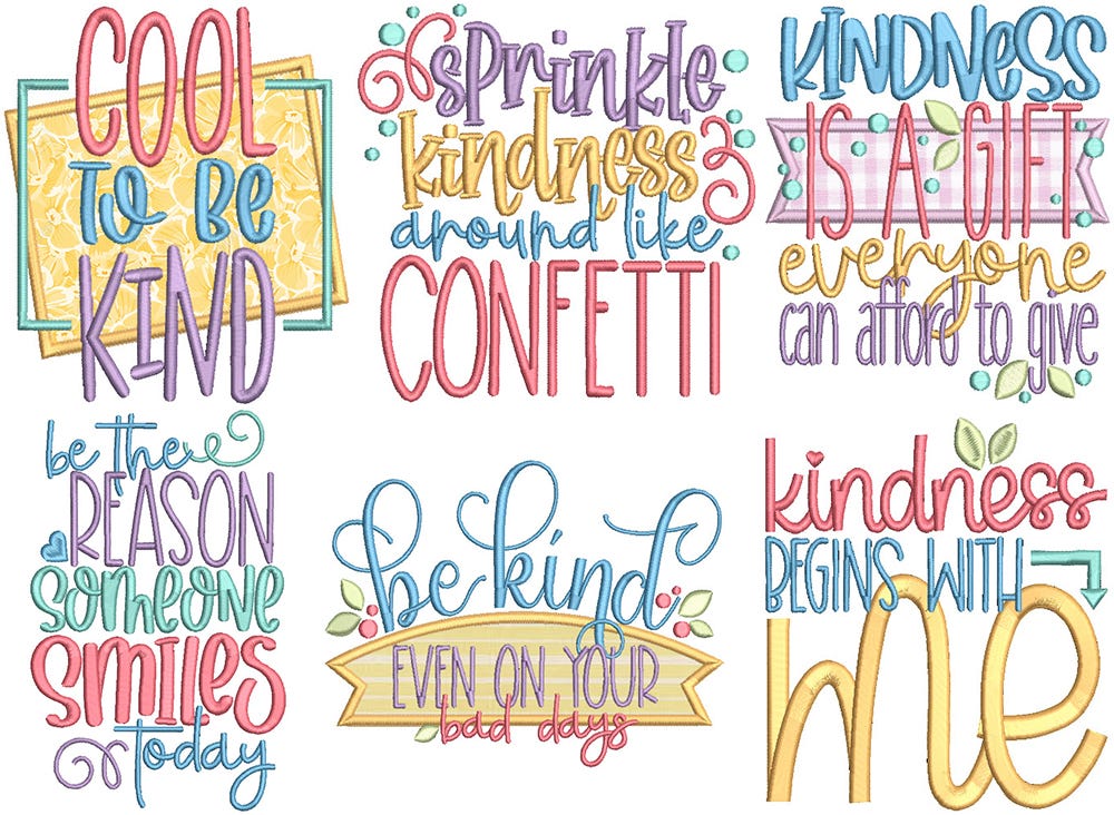 *Please note that the following designs contain applique components:Ā Cool to be kind / Kindness is a gift everyone can afford to give / Be kind even on your bad days /Ā