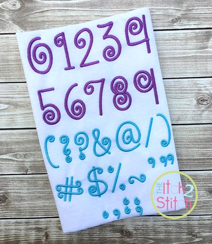 You will receive all Aa-Zz letters, numbers 0-9, and partial punctuation (79 files) in six sizes . Please note that due to scale not all 3" and 3.5" letters fit in the 4x4 hoop.