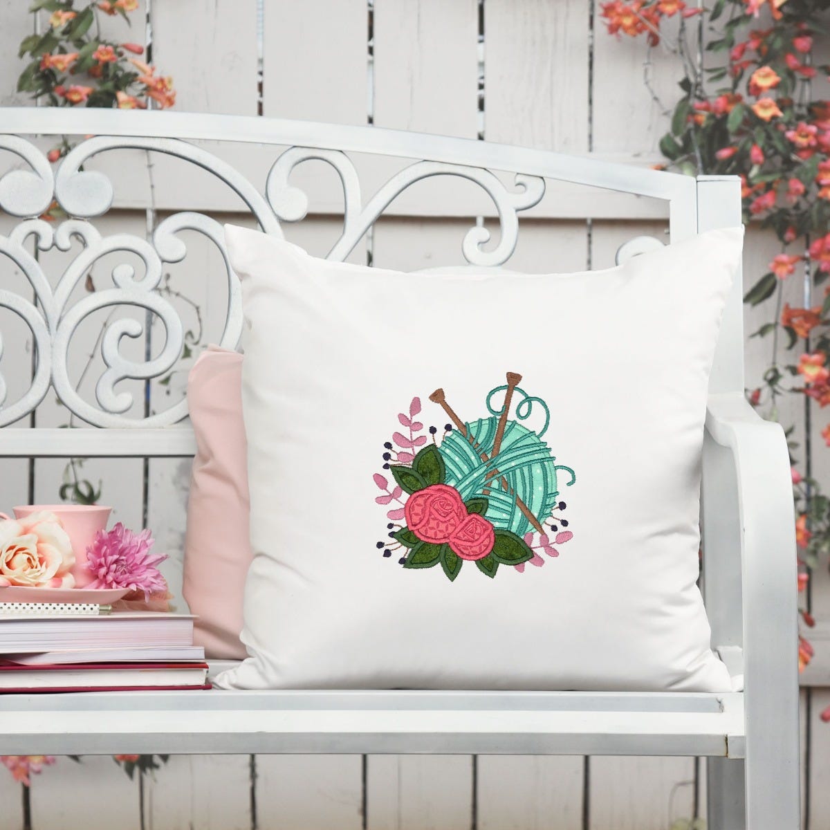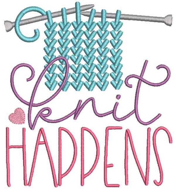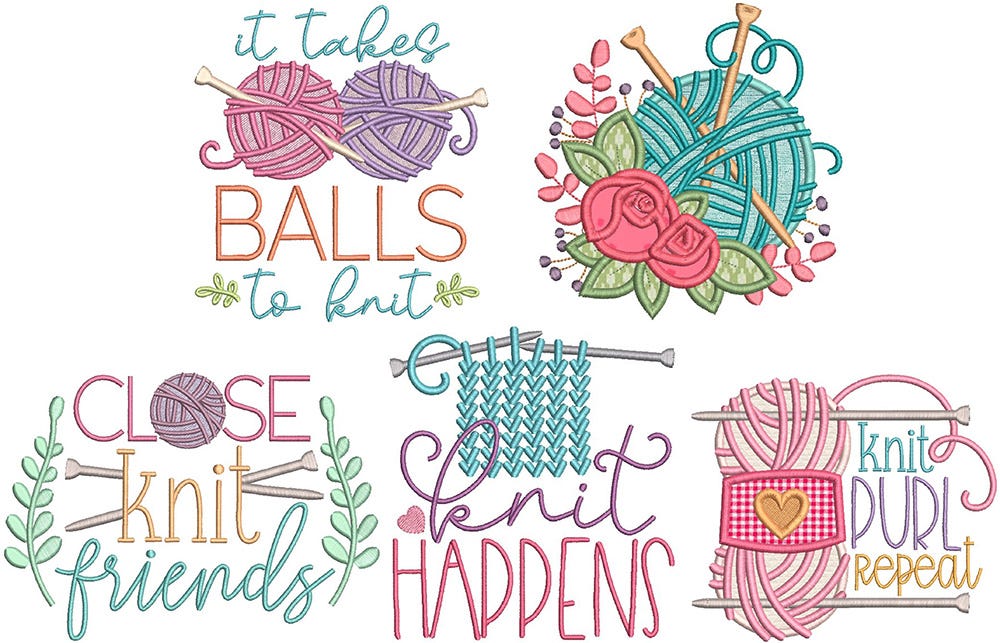 5 witty knitting word art designs featuring satin stitch lettering with applique and fill stitch yarn images. 4x4, 5x7, 6x10 and 8x8 hoop sizes included.