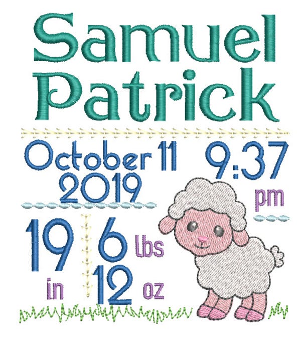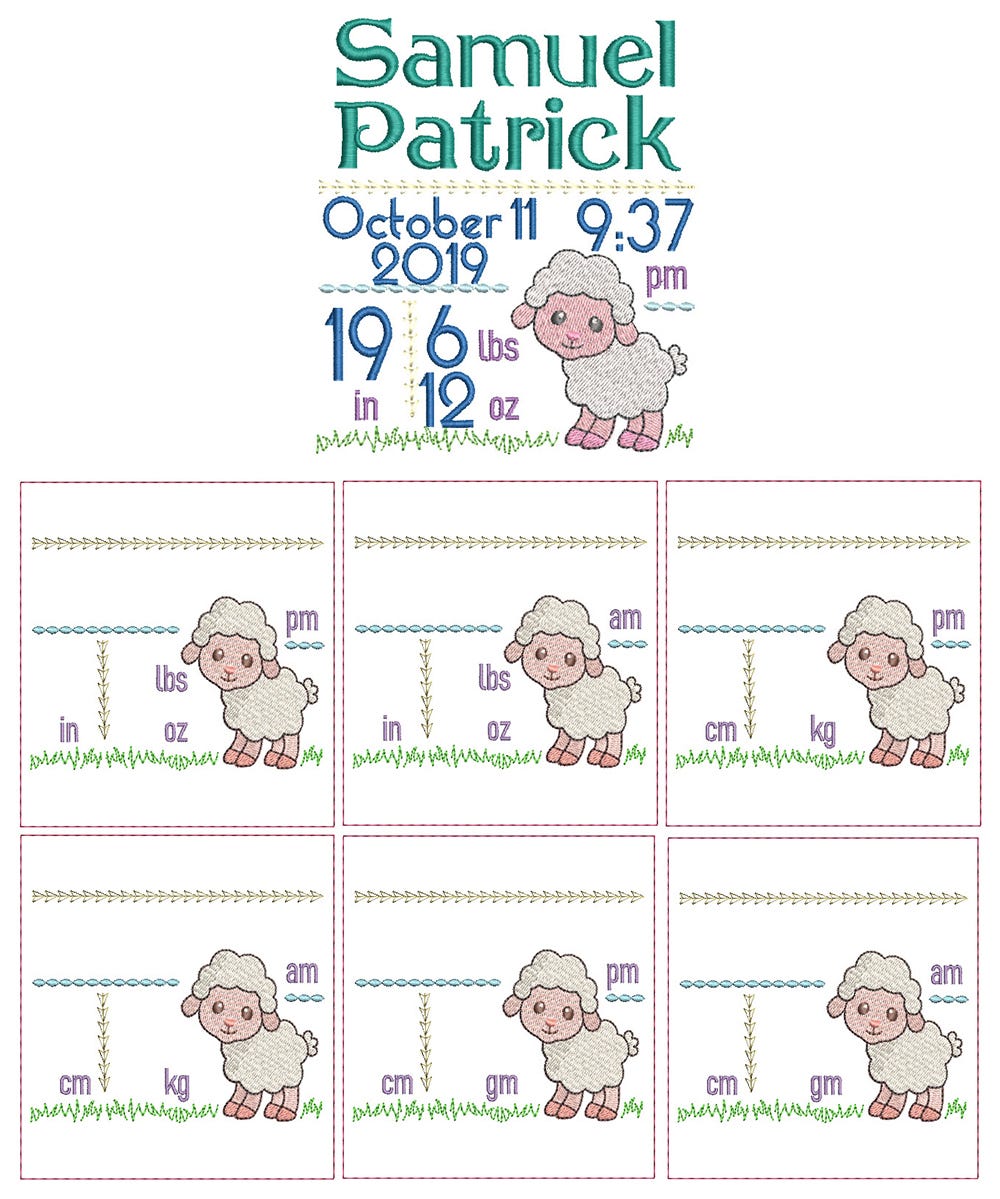 You will receive the embroidery templates shown. Customize with your own names, date, weight and length with fonts from your purchased collection or those that are built in to your embroidery software. Fonts are NOT included with these templates. I have included a "basting" stitch as the first step so that while you are customizing in your software, you can ensure to stay with the parameters of your hoop. Skip the first step upon stitching.