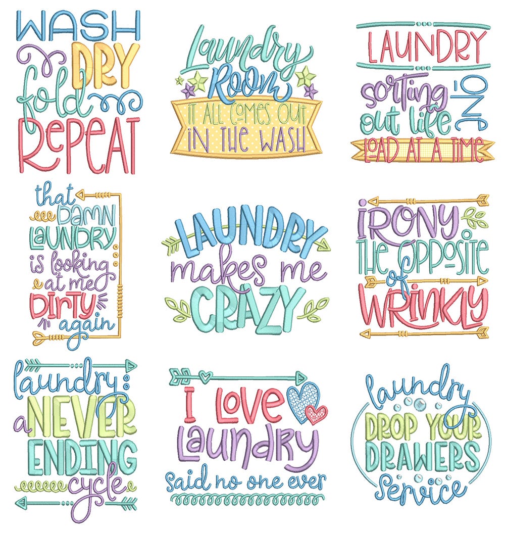 *Please note that the following designs contain applique components: "Laundry room - it all comes out in the wash" / "Laundry - sorting out life one load at a time."