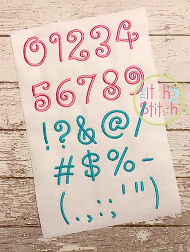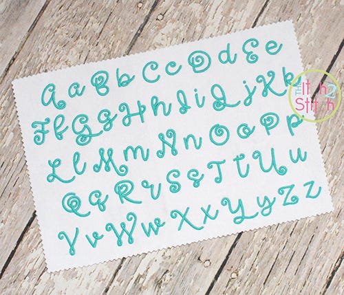 You will receive all Aa-Zz letters, numbers and partial punctuation (79 files) in six sizes. Please note that due to scale some letters from the 3" and 3.5" sizes do not fit in a 4x4 hoop.