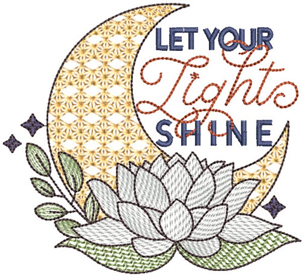 Let Your Light Shine is a single design featuring a blend of sketch and motif fills with satin stitch and bean stitch lettering.