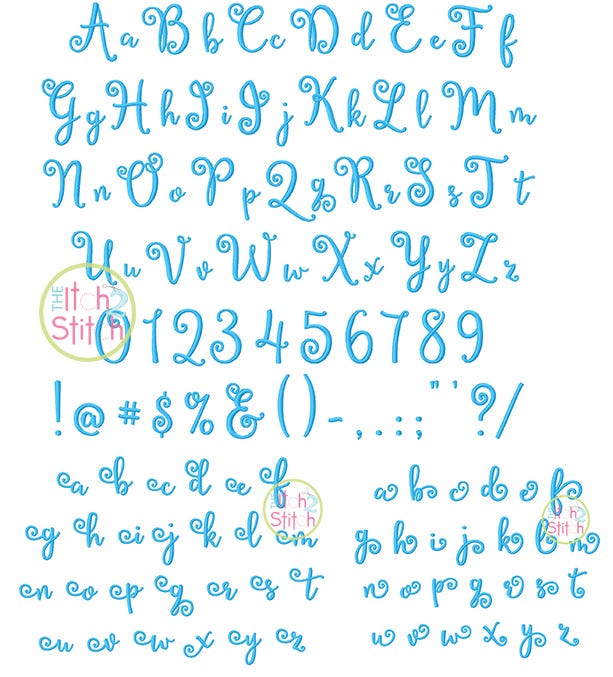 You will receive all regular Aa-Zz letters, alternate left and alternate right lowercase letters, numbers and partial punctuation (131 files) in four sizes (1.5", 2", 2.5" & 3").