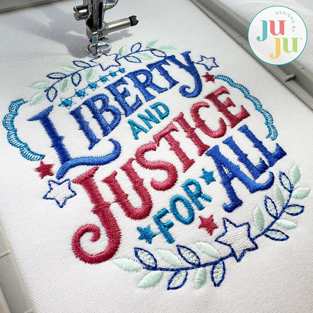 Liberty And Justice For All! This word art design, embellished with leaves, stars, and decorative elements is perfect for your patriotic stitching needs!