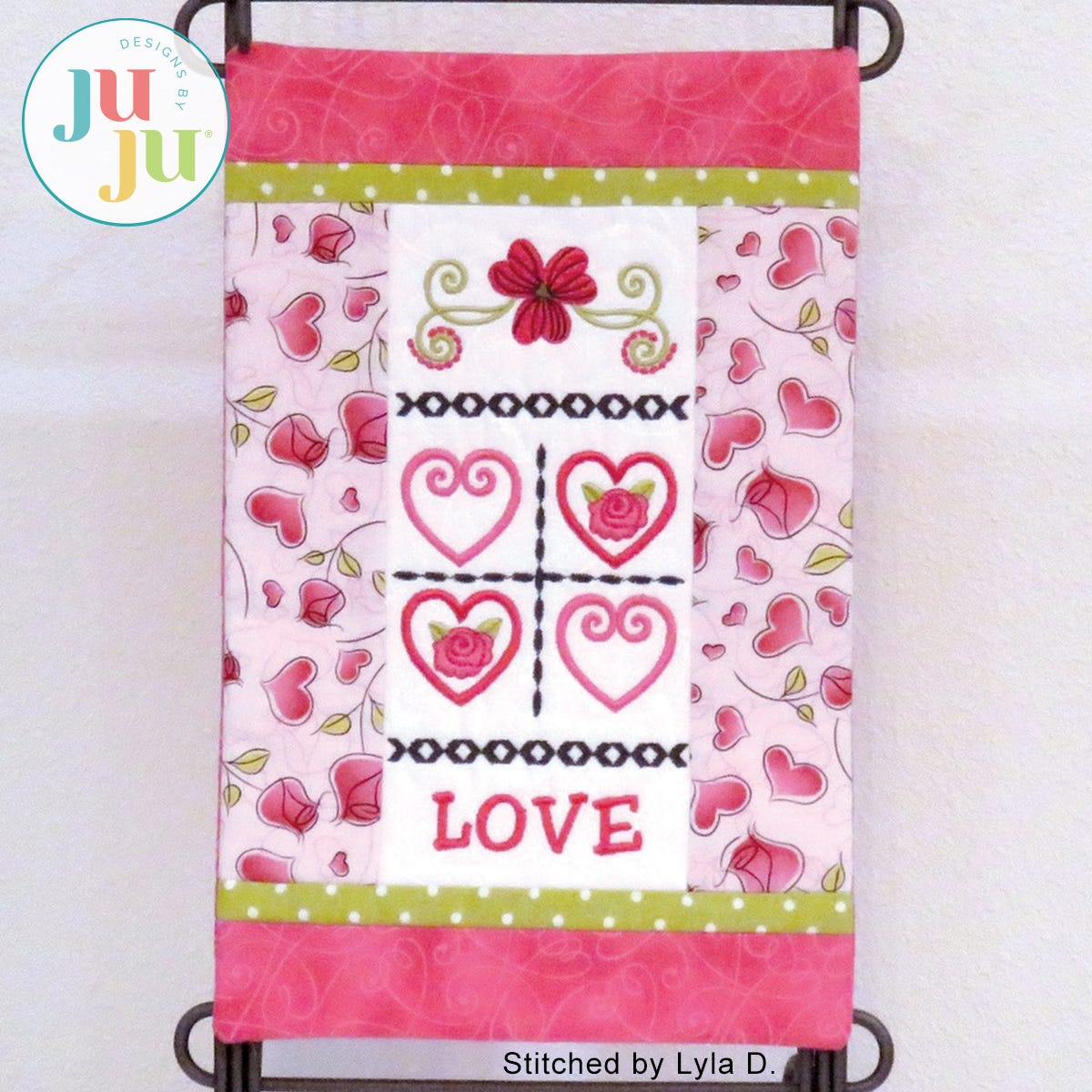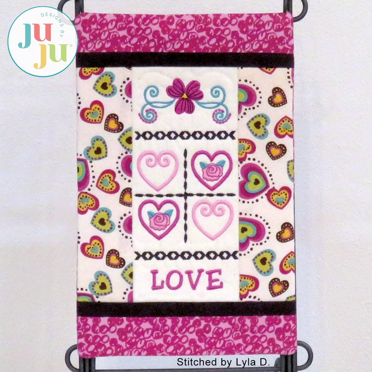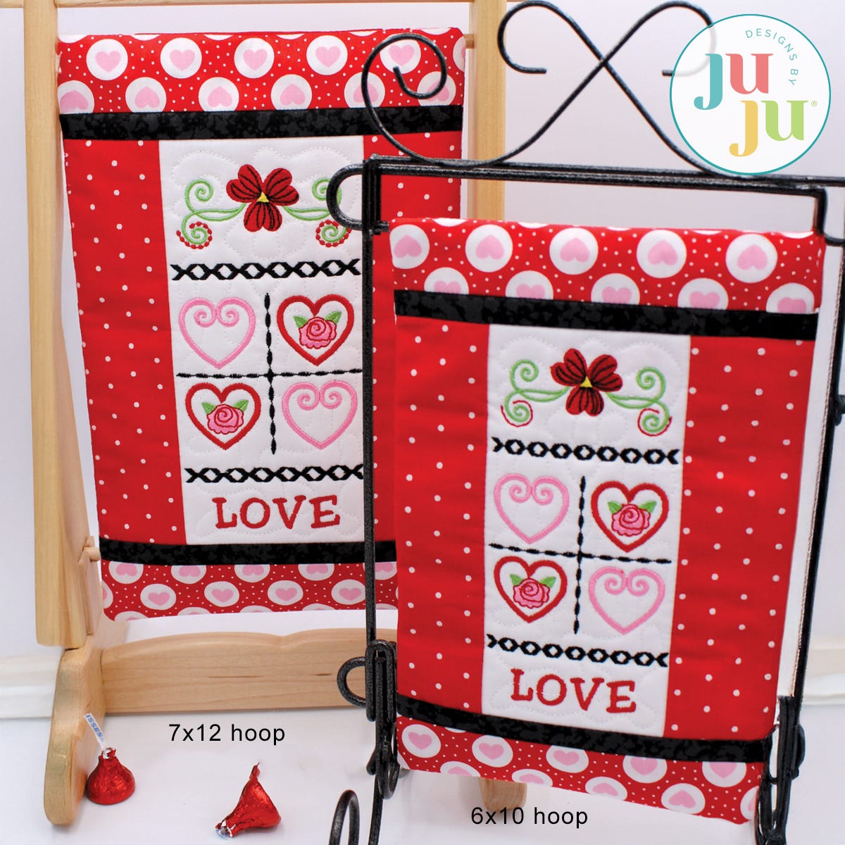 Here is a fun project that will help you decorate for the month of February. The center of the mini quilt is lightly quilted in the hoop and the various borders get attached during the embroidery. There is a “sleeve” in the back that will make it easy to hang the quilt. The sleeve, too, is applied during the embroidery process. No additional hand or sewing machine stitching is required.