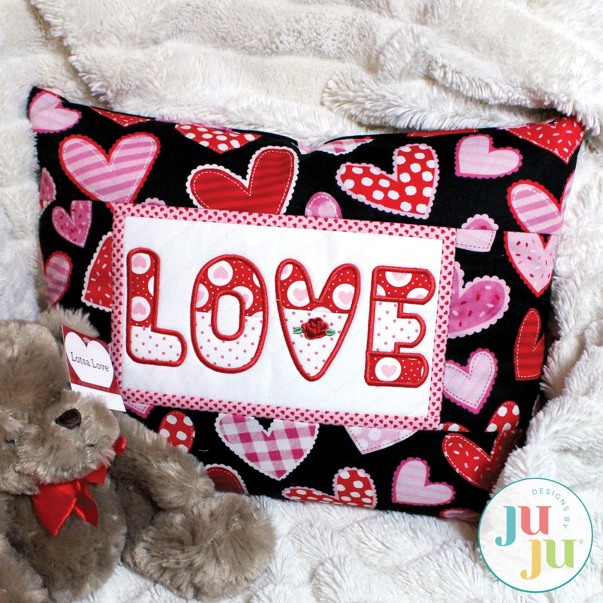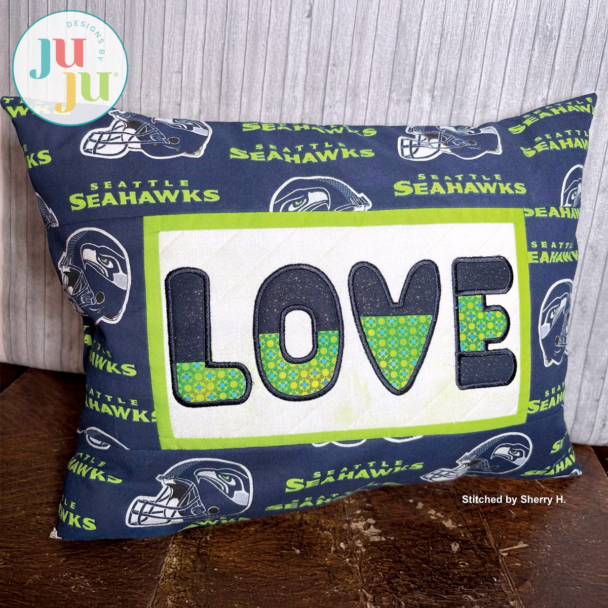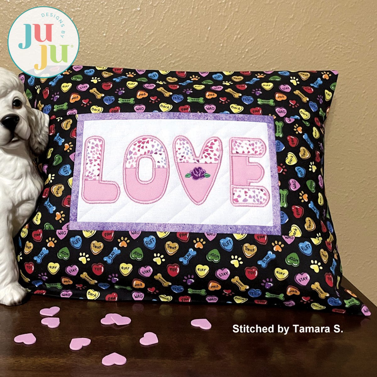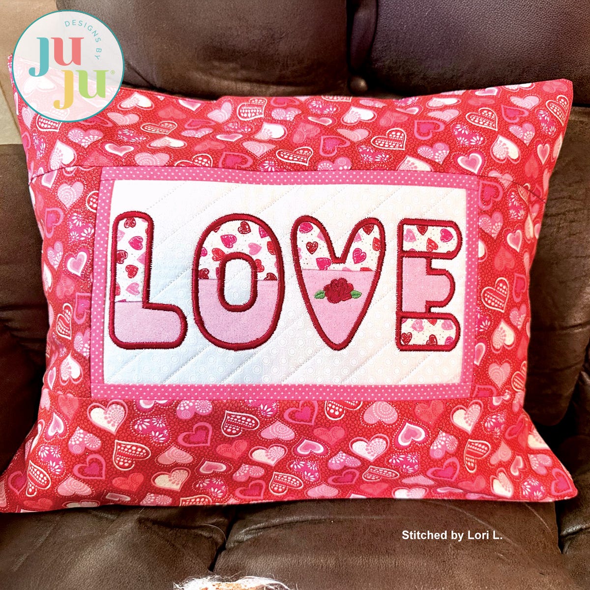 This very versatile pillow cover is made as a mostly in the hoop project. The background is quilted and the contrast strips and borders get attached on the embroidery machine and the seams get completed on the sewing machine. Each appliqued letter of the word "Love" is made up of 2 fabrics. It's easy to do. We show you how. A simple envelope style back is made very quickly and then gets attached to the front by sewing machine. You can skip the small rose design if you wish. This pillow case can be used for so many purposes. Let it reflect your love of sewing, pets, sports teams, babies, music etc. by using the appropriate fabric.