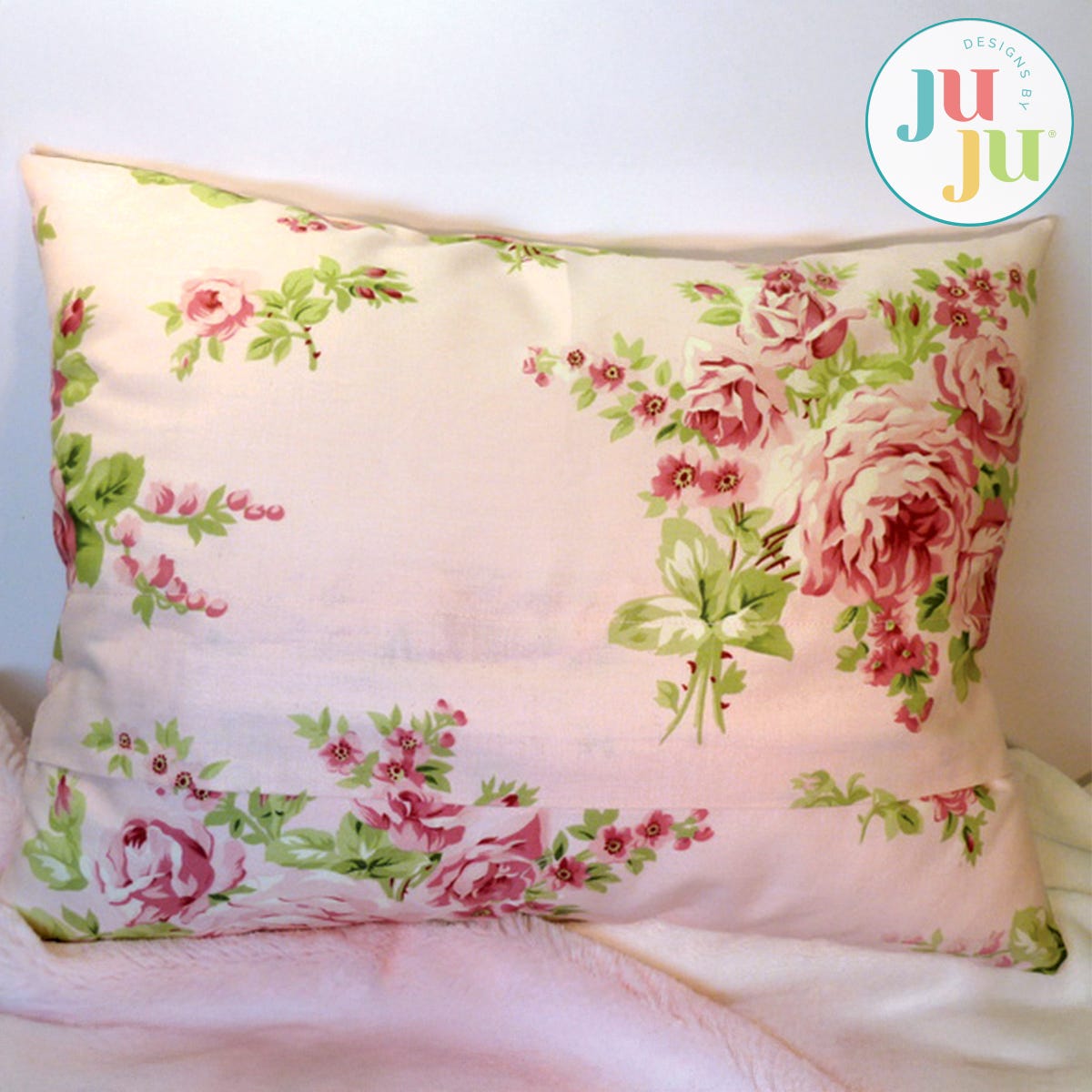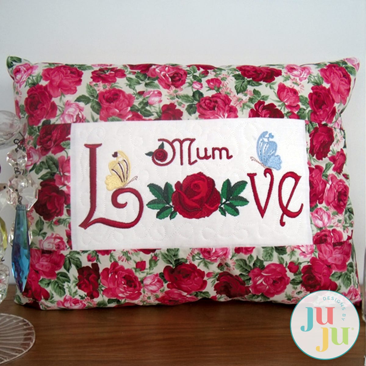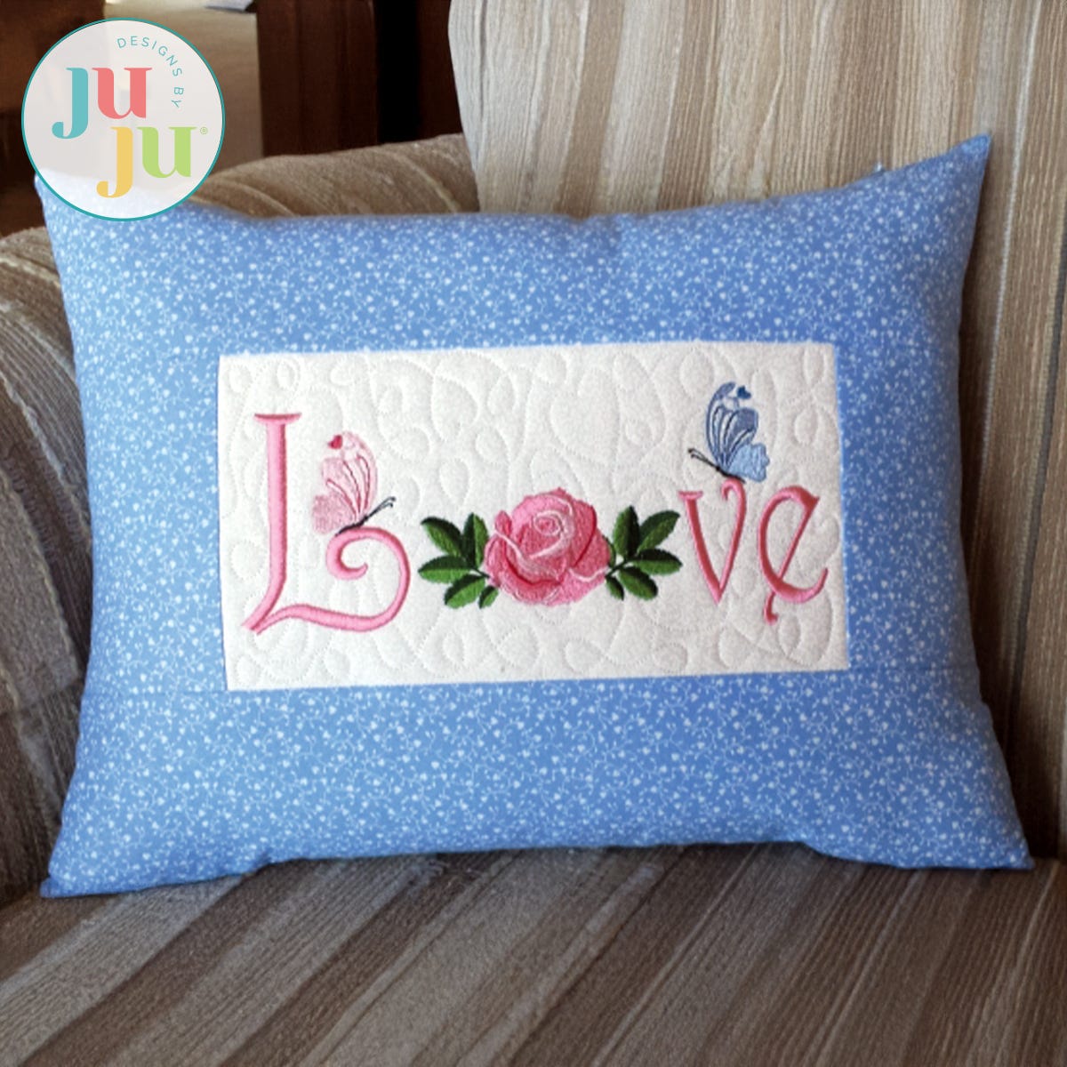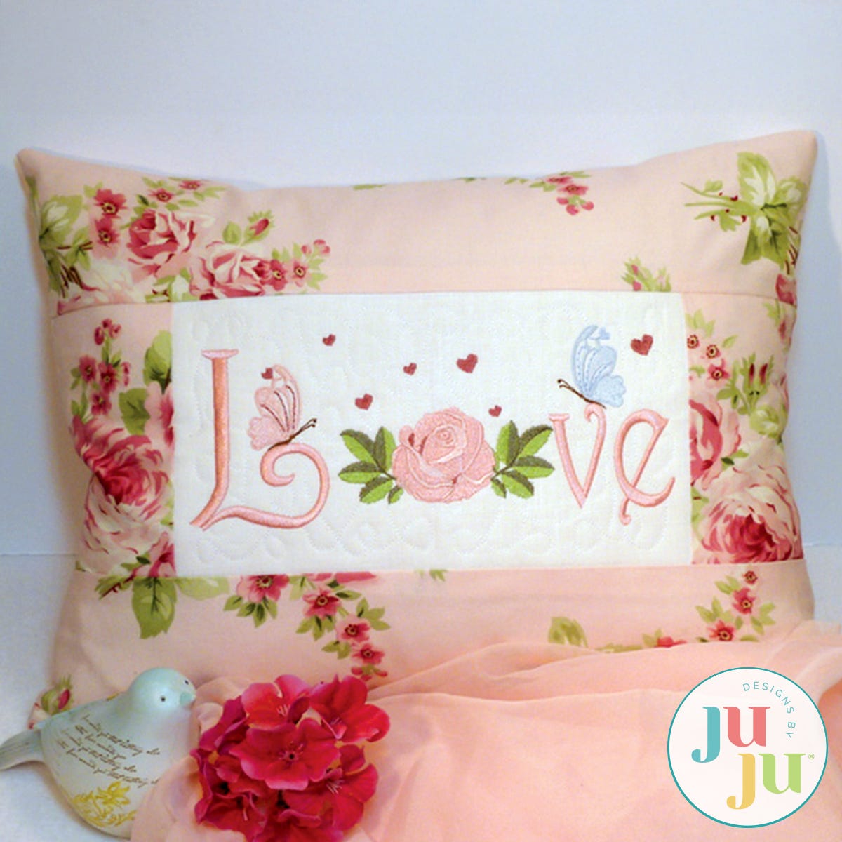 This design will allow you to make a 12x16" pillow — almost completely done in the hoop. The pillow's center background is meander quilted and the sides are pieced onto the center, all done in the hoop. Includes a velcro back closure. It makes a perfect little travel size pillow. The side seams are sewn on the sewing machine. PDF instructions included. Great project for Valentine's, weddings or anytime you want to express love to somebody special.