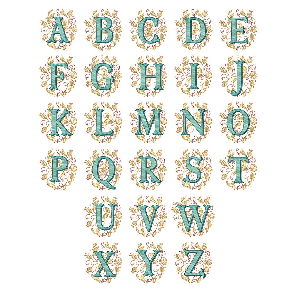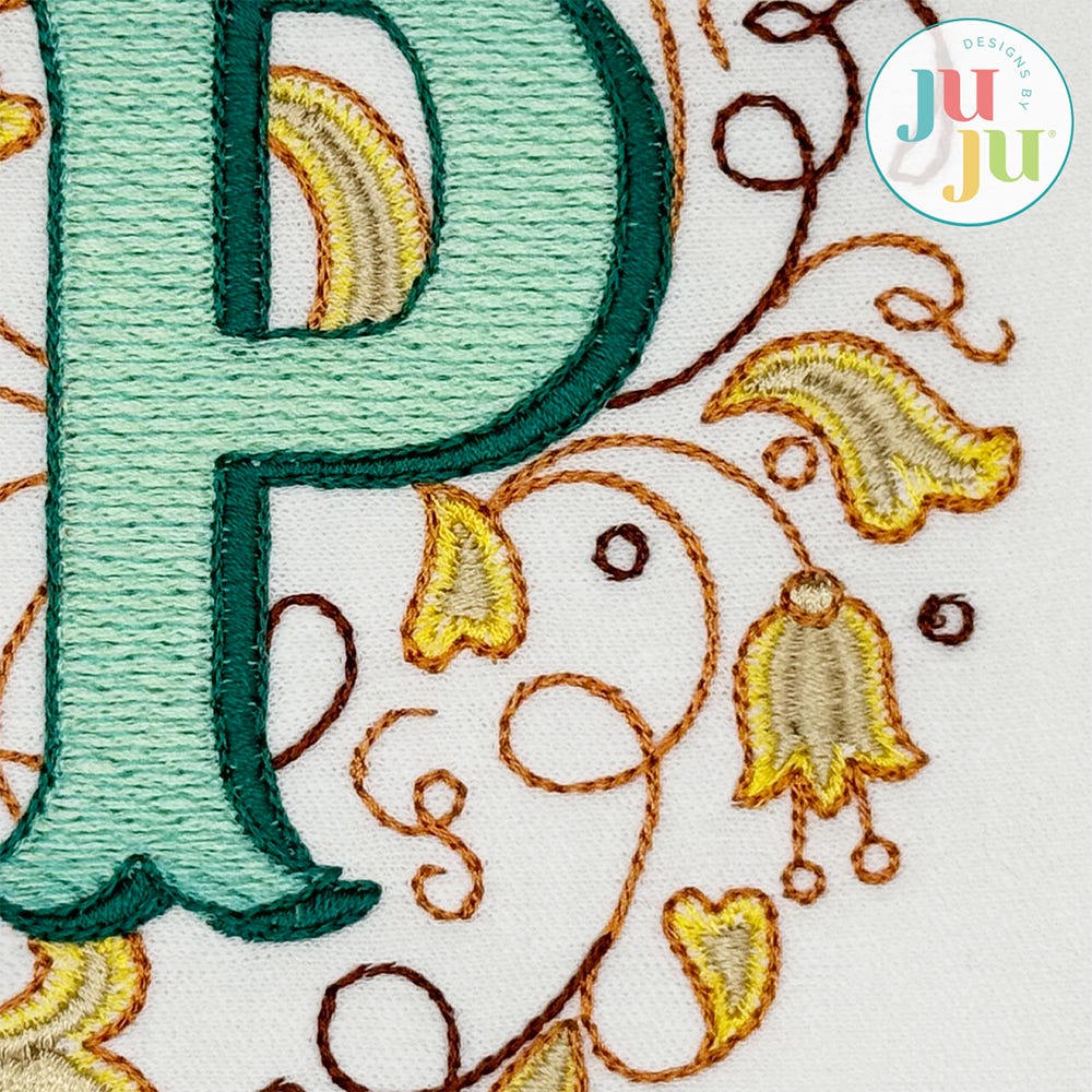 Add timeless elegance to your projects with our Mabel Monogram. This embroidery-only monogram features a blend of stitch types to create beautifully layered letters framed by intricate floral and scrollwork accents for a sophisticated look.