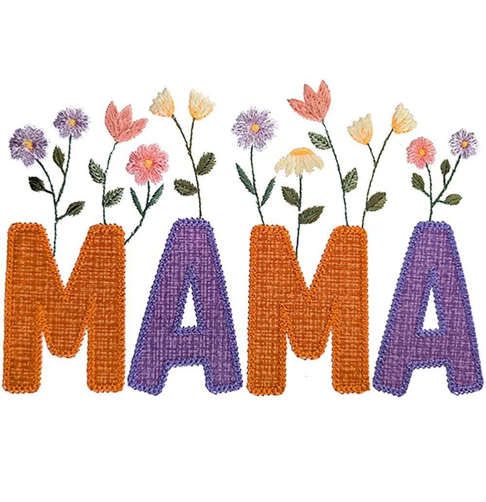 The name "Mama" is accented with beautiful, delicate florals in this Heirloom Garden Applique design. A blend of fill and bean stitches are used for flowers that bloom gracefully from the applique lettering. The applique letters are included in the design as shown, and are finished with a decorative chainstitch.