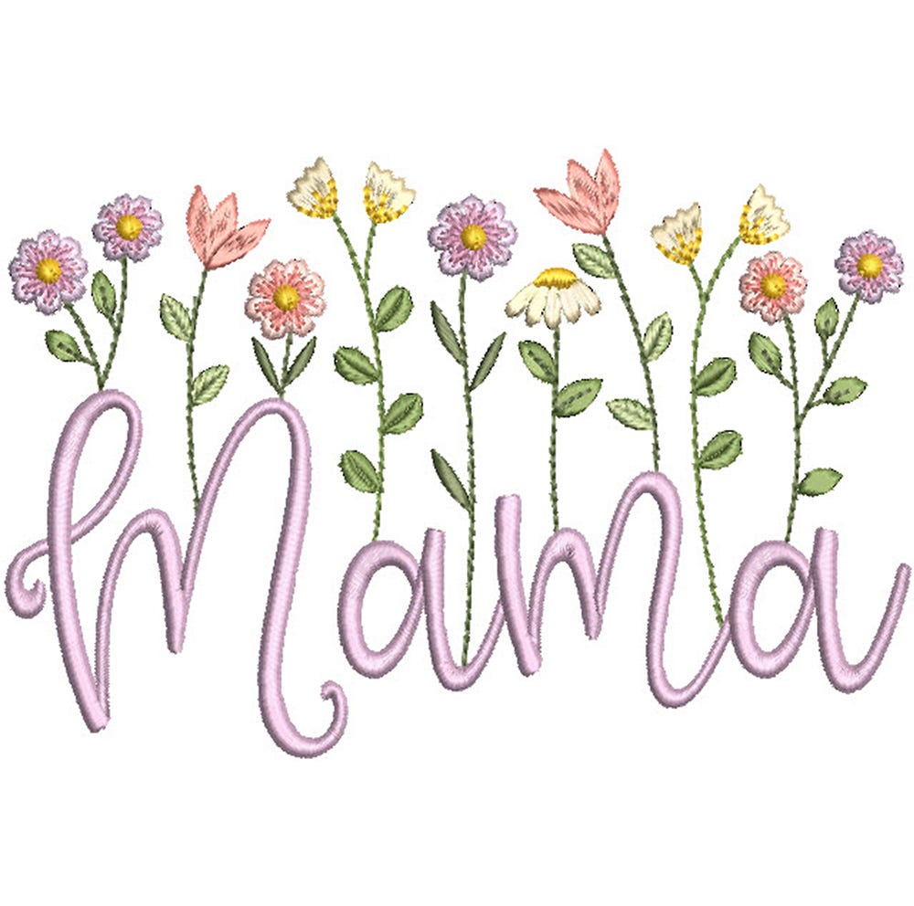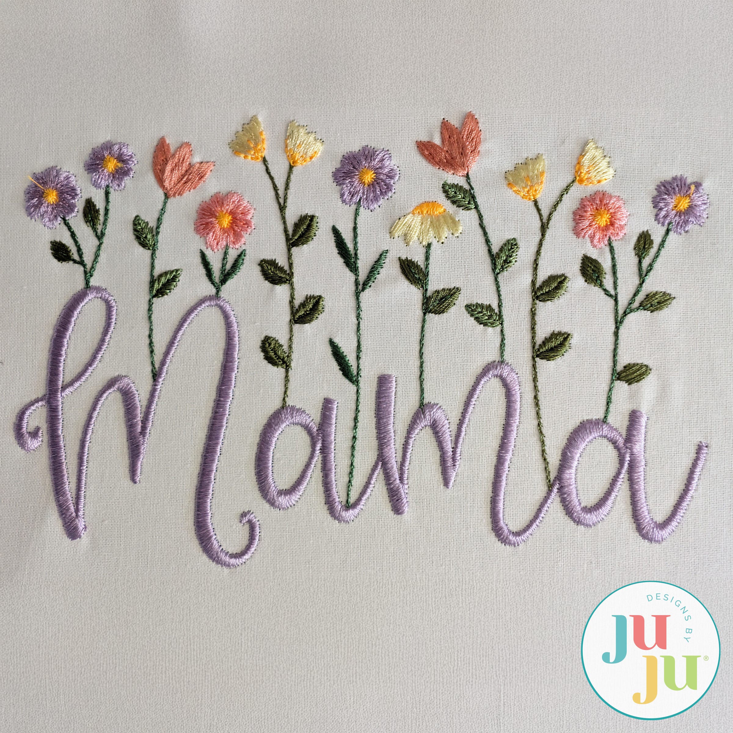 The name "Mama" is elegantly showcased in this embroidery-only design, adorned with delicate floral accents. A blend of satin and bean stitches creates beautifully stitched flowers that gracefully bloom from the lettering, adding a timeless touch.