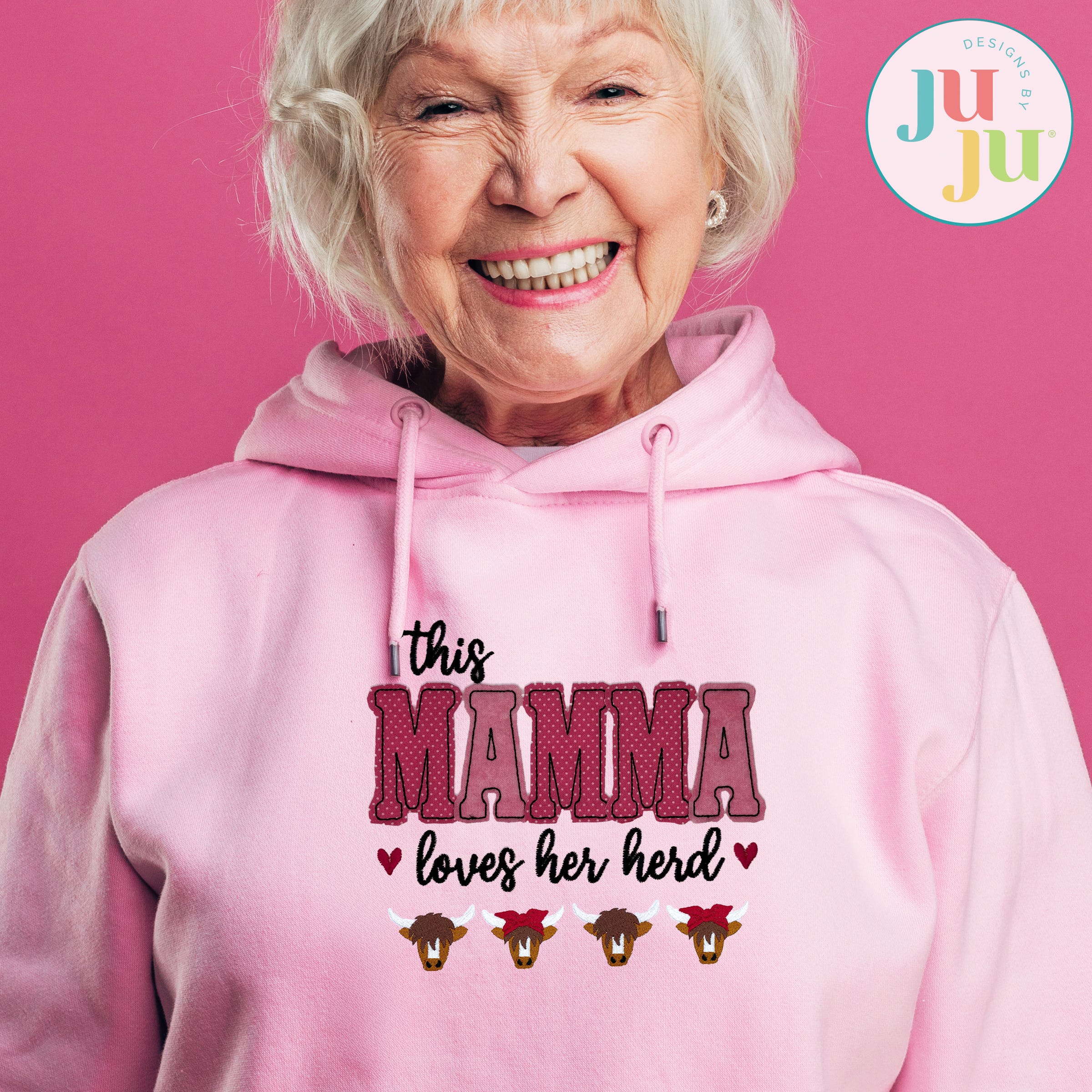 This Mamma Loves Her Herd! The design set includes one applique in four sizes (4x4, 5x7, 6x10 and 8x8), plus two fill stitch Mini Highland Cows that can be used to customize your project. Add the number of boy and/or girl minis to represent your herd. Place them under the applique design or on the sleeve of a shirt; personalize with the font of your choice!