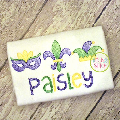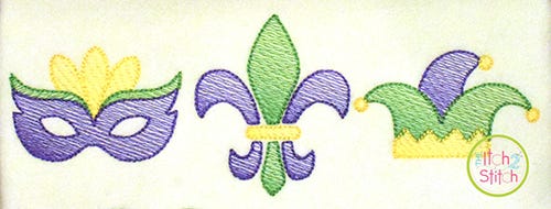 The light and airy "sketch" fill pattern allows for a quick stitch out. The space between each line of stitching varies such that it is more dense at the bottom of the object than top to create the shading effect. The objects are finished off with a bean stitch outline.