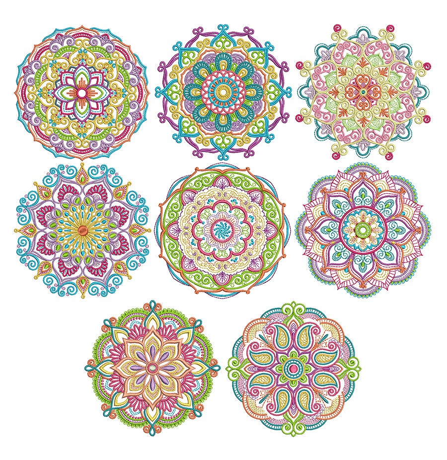 8 *exquisite*, bright and colorful mandala designs! 3 sizes each: 5x7 6x10 and 8x8