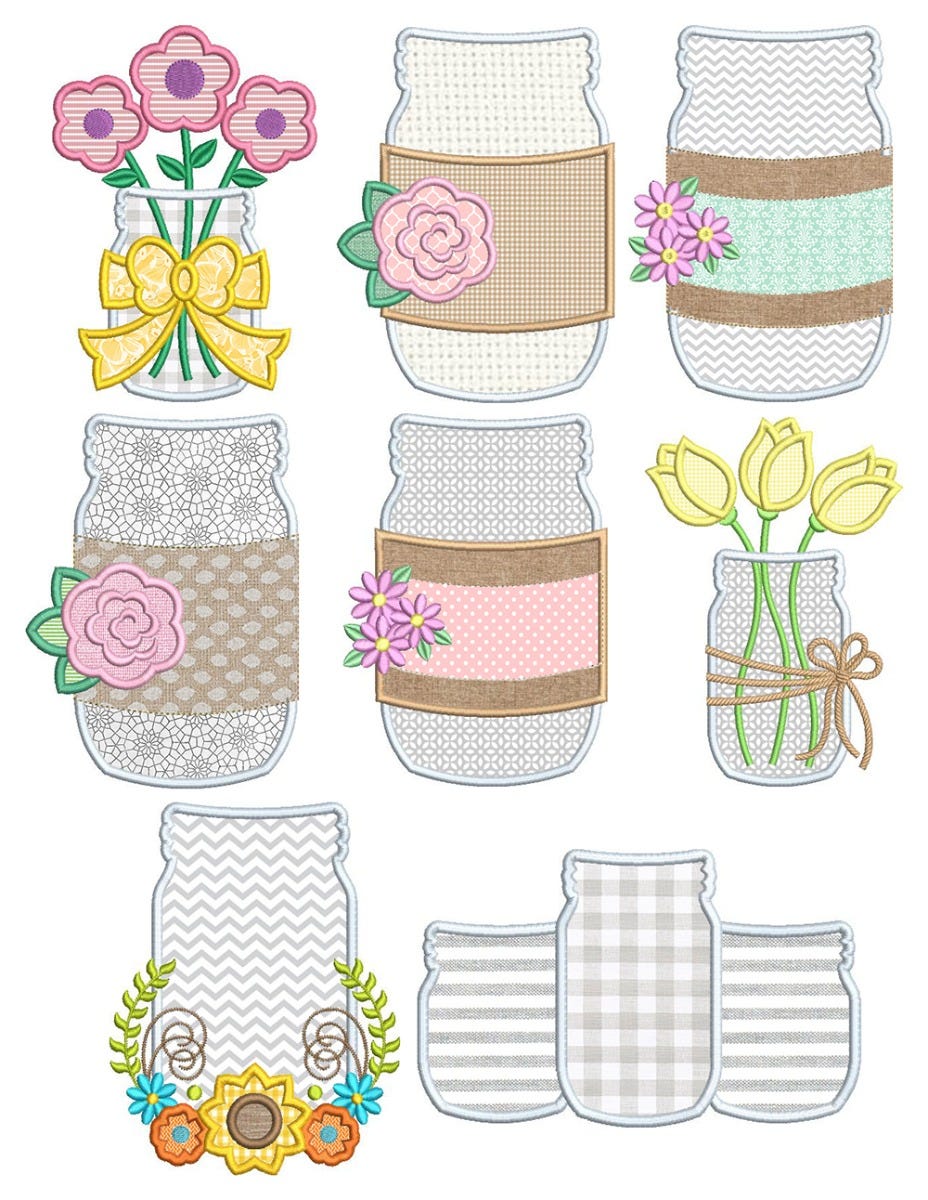 8 beautiful mason jar applique designs!