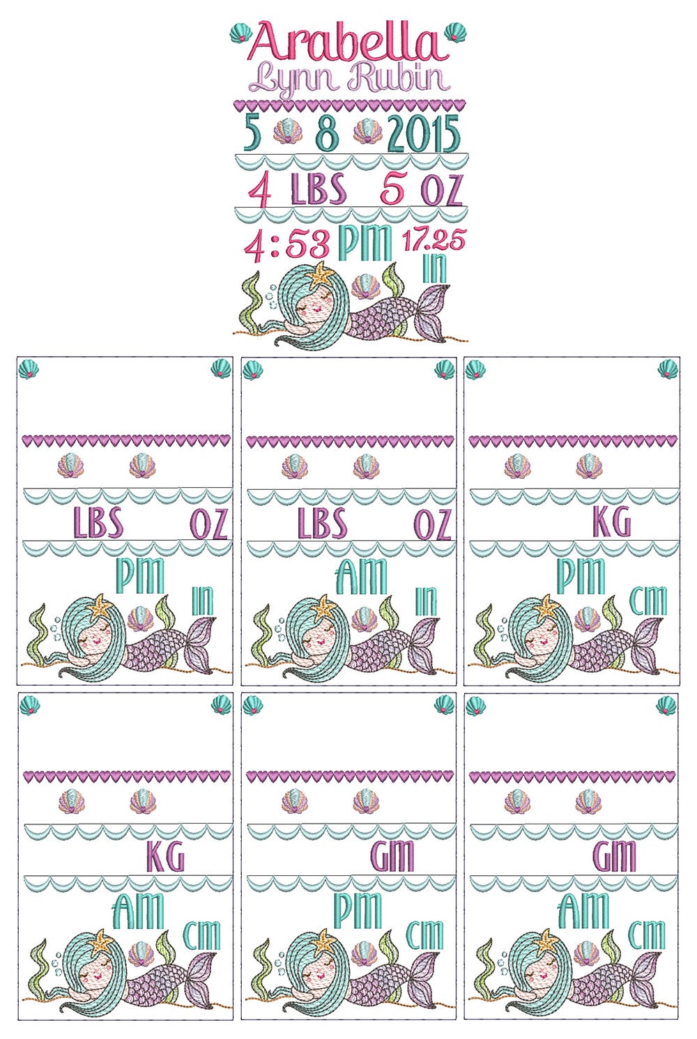 You will receive the embroidery templates shown. Customize with your own names, date, weight and length with fonts from your purchased collection or those that are built in to your embroidery software.Ā I have included a "basting" stitch as the first step so that while you are customizing in your software, you can ensure to stay with the parameters of your hoop. Skip the first step upon stitching.