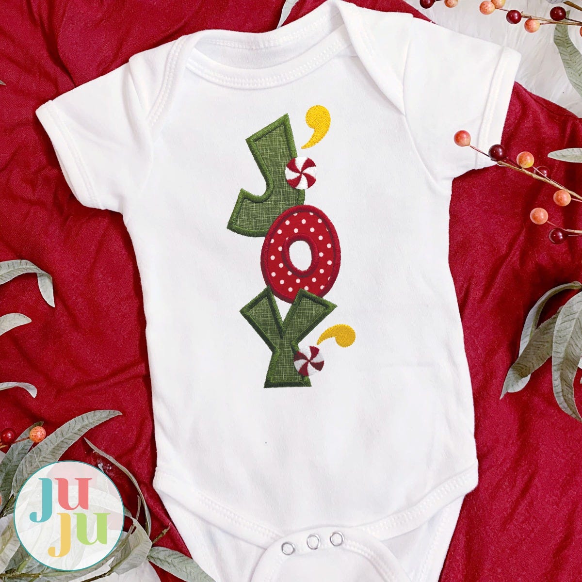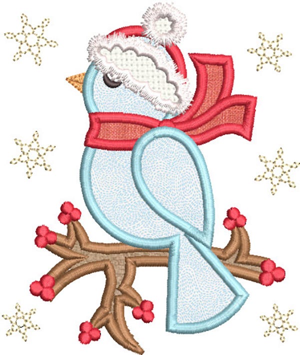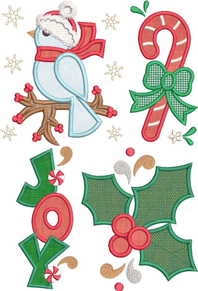 Four adorable Christmas themed applique designs! The set includes a winter bird, candy cane with bow, holly, and the word JOY.