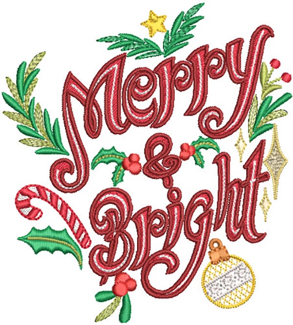 May your days be Merry and Bright! This single embroidery-only text design features fill stitch lettering with a