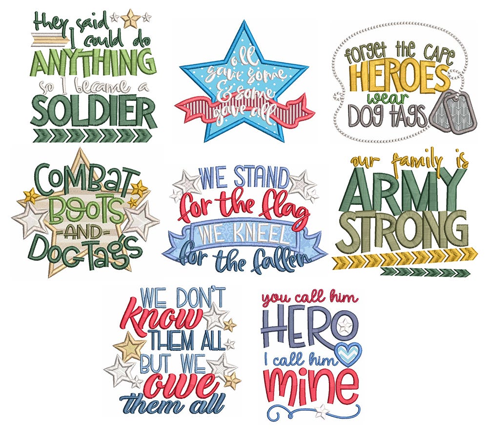 *Please note that the following designs contain applique components: All gave some and some gave all / Forget the cape heroes wear dog tags / Combat boots and dog tags / We stand for the flag we kneel for the fallen / We don't know them all but we owe them all / You call him hero I call him mine