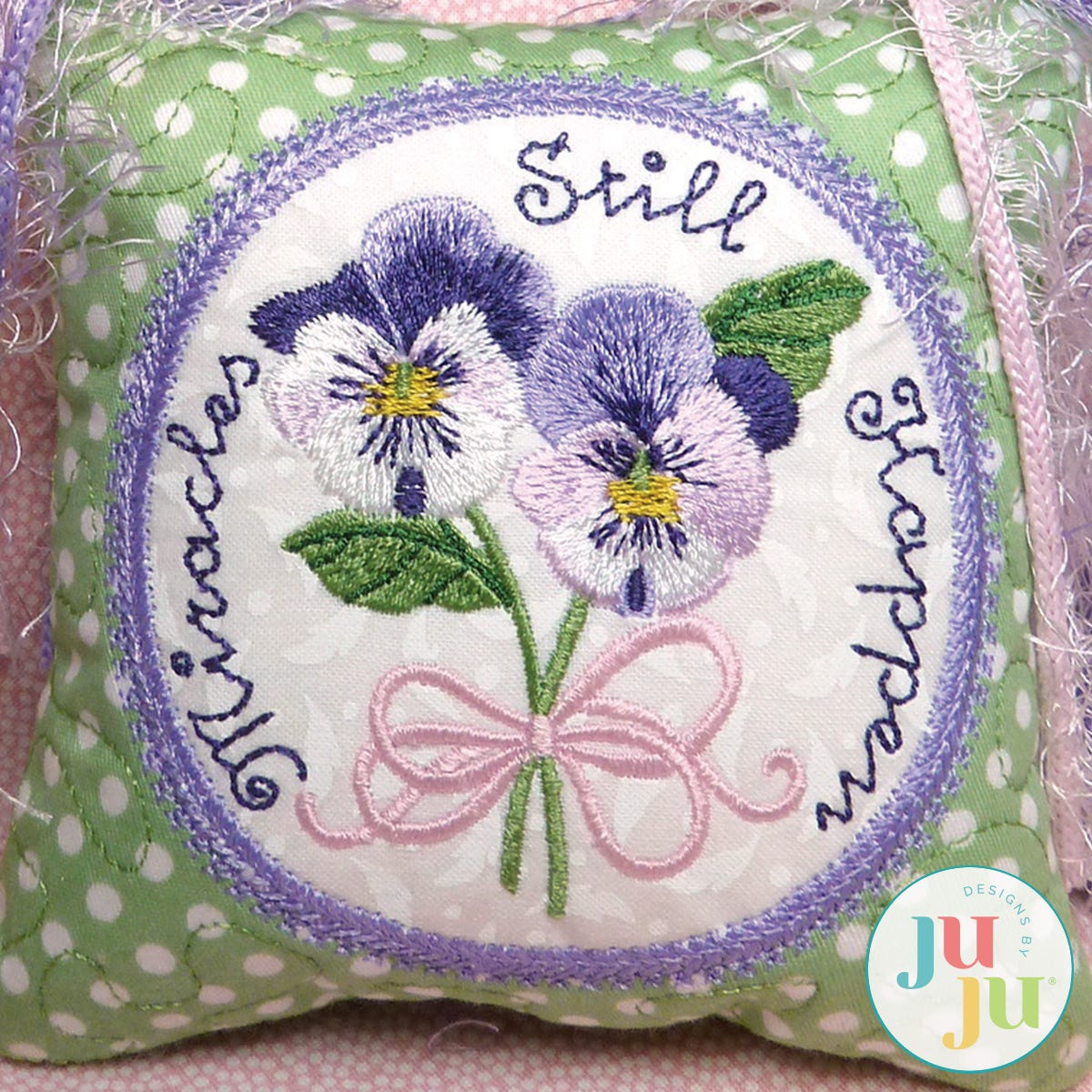 Use this sweet little pillow to bring hope and inspiration to somebody who is facing a difficult situation in life. The pillow is almost completely made in the hoop and only requires closure of a small opening at the bottom of the pillow either by hand or by fusion. The center is reverse appliqued it's easy; we show you how. Part of the little pillow is stipple quilted.