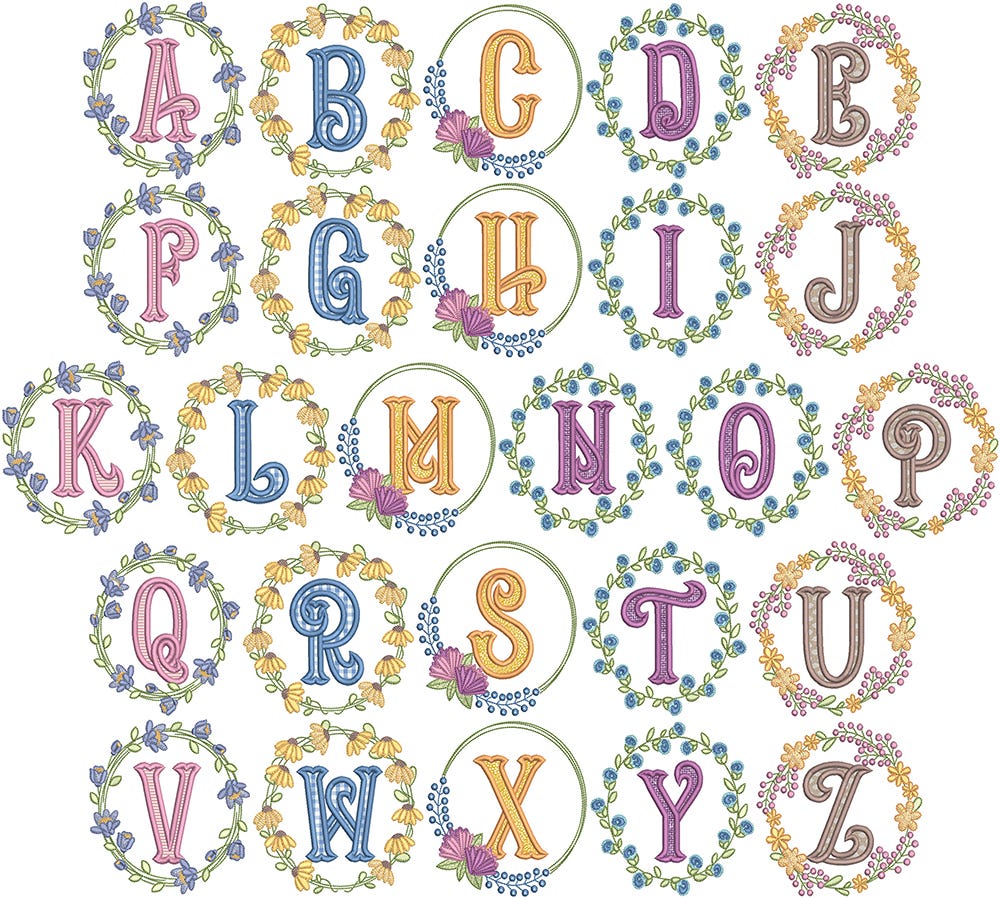Our Mireille Alphabet feature an applique letter in the center of an embroidered frame. There is one file per letter, as pictured.