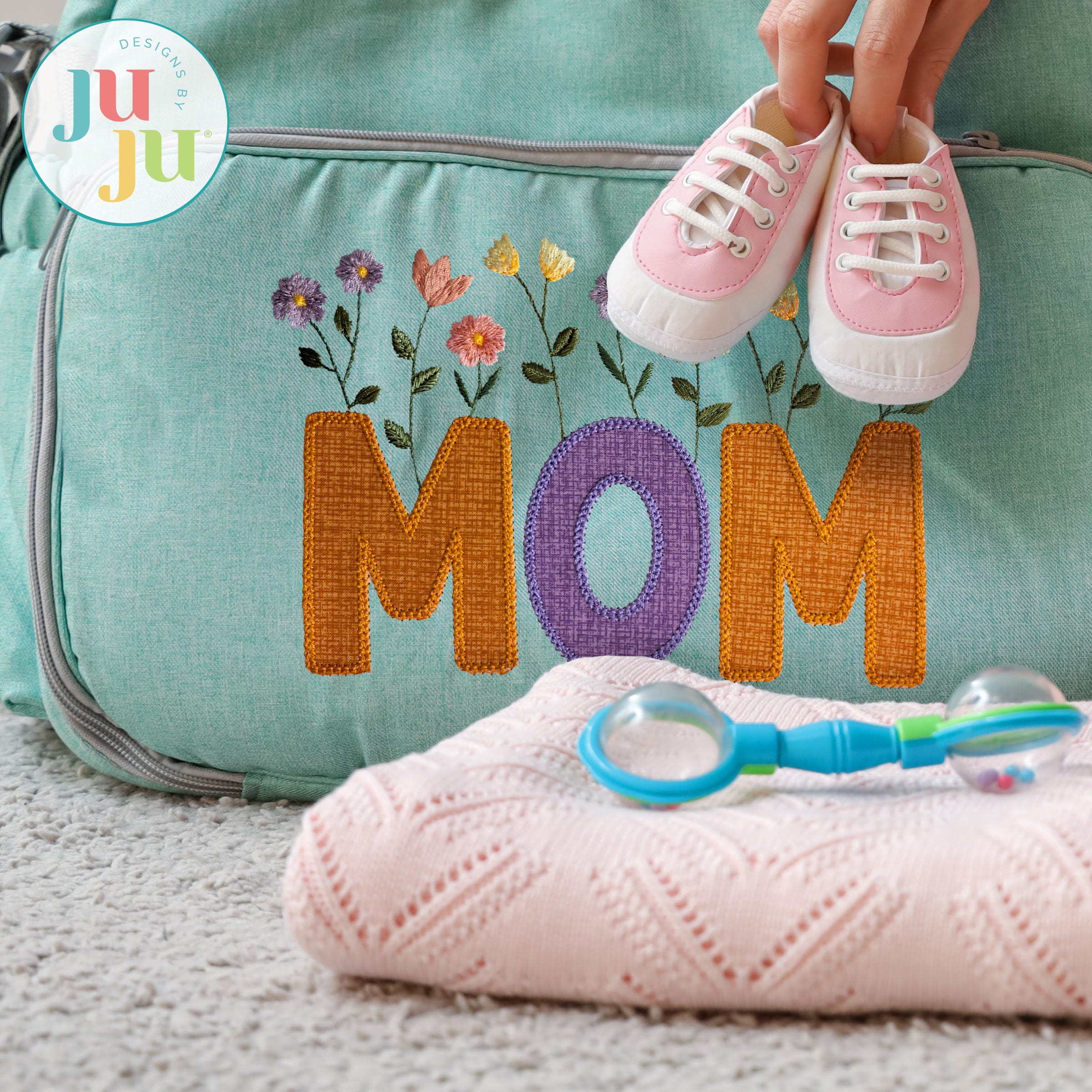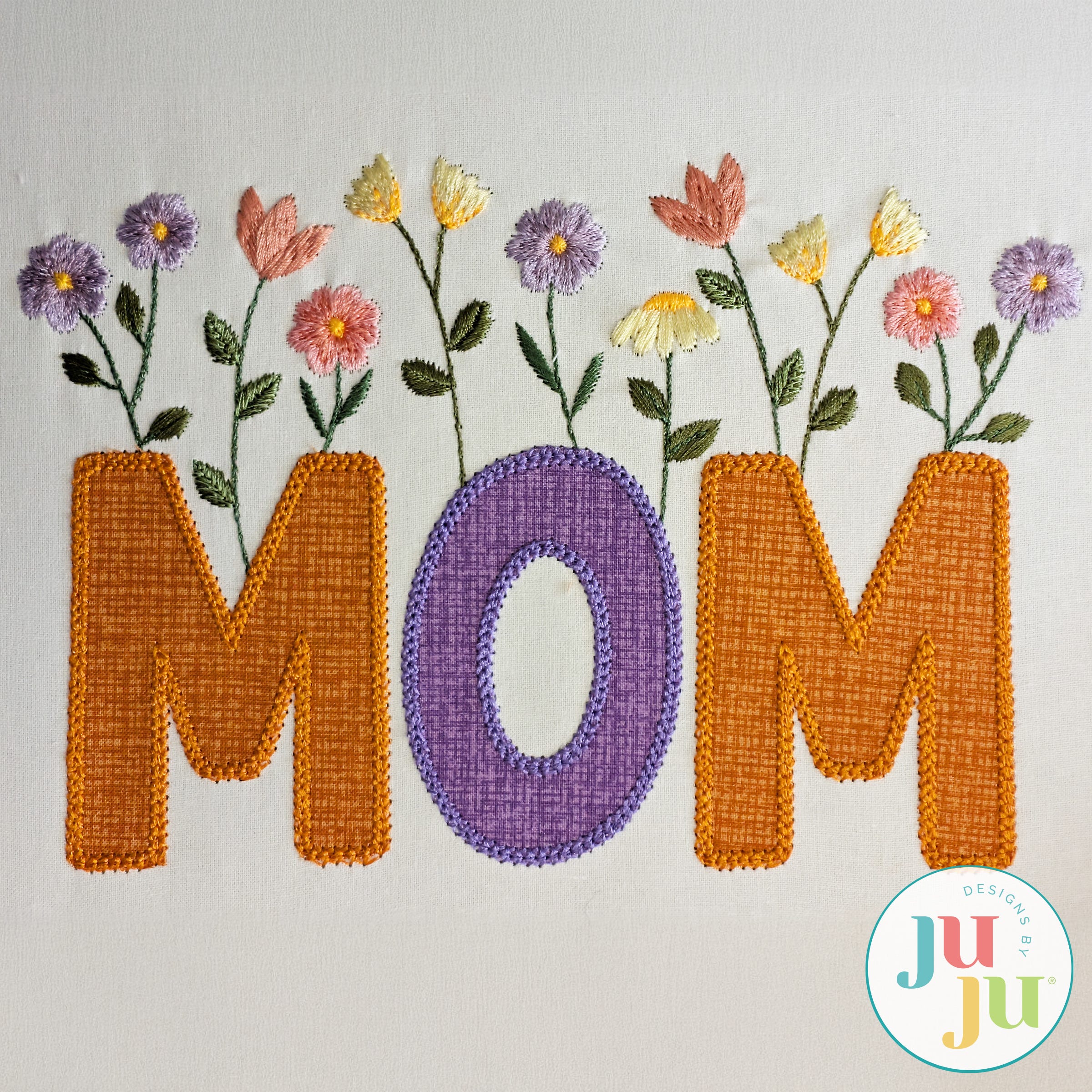 The name "Mom" is beautifully embellished with delicate floral accents in this Heirloom Garden Applique design. A blend of fill and bean stitches are used for flowers that gracefully bloom from the lettering. The applique letters are included in the design as shown, and are finished with a decorative chainstitch.