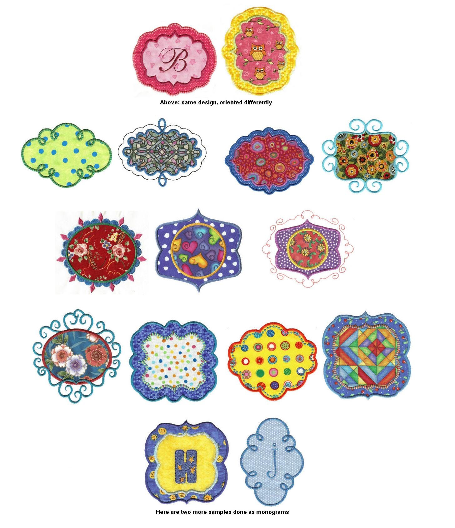 Chic boutique frames in applique for monograms, quilt labels, names, other text, or just to frame your favorite character or novelty fabric. Great for child and adult projects alike! Add your favorite monograms, alphabets, or even applique letters using your customizing software. (alphabets not included)