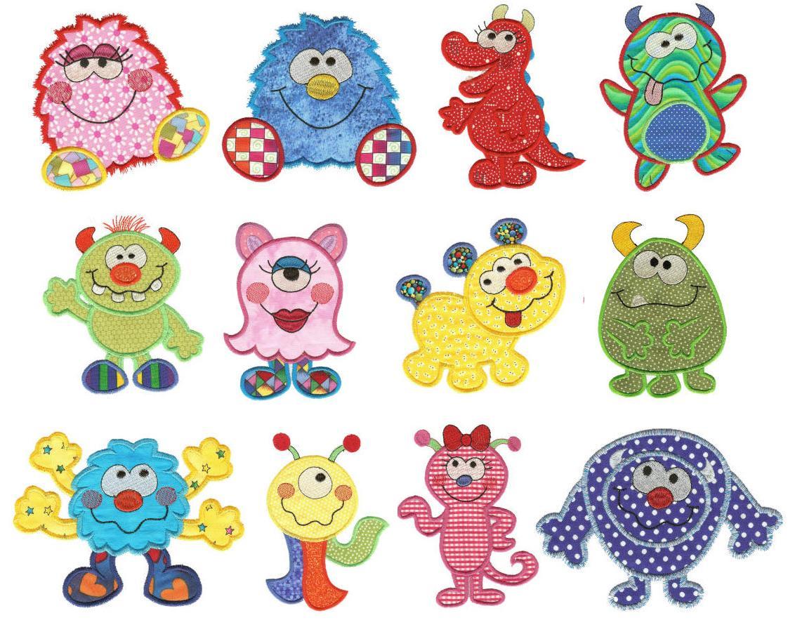 12 silly, funny and not at all scary monsters in applique..great for halloween or any time just for fun.