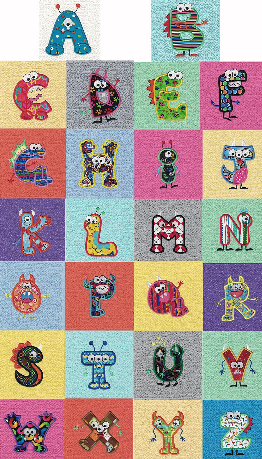 It's time to do the monster bash with this adorable "Monster Party" applique alphabet. Each letter is a unique, friendly monster for the little one in your life. This set is a HUGE value! Includes applique letters for all 26 letters in 4 sizes each: 4x4 hoop, 5x7 hoop, 6x10 hoop and 8x8 hoop. For those who have liked our previous quilt stipple blocks with appliques, we've included each letter with a stipple background. Those also come in 4 sizes: 4 inch, 5 inch, 6 inch and 8 inchĀ