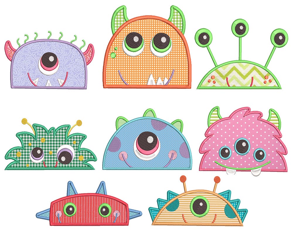 8 adorable monster peeker designs in applique! Great for hooded towels!